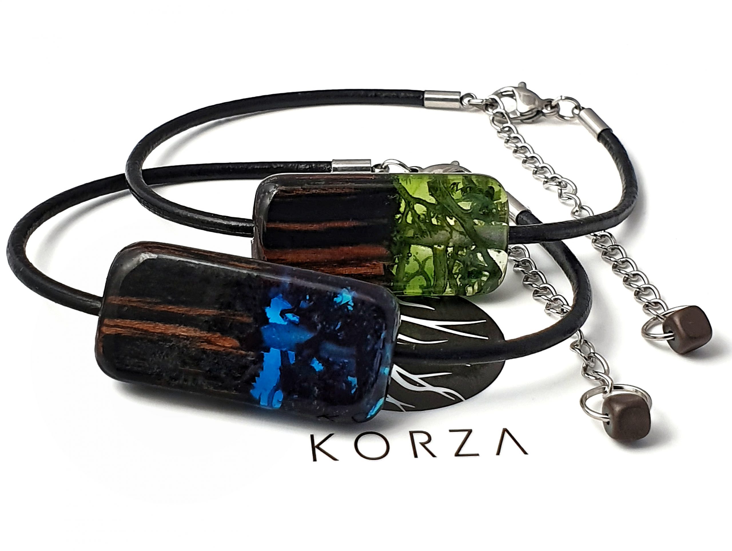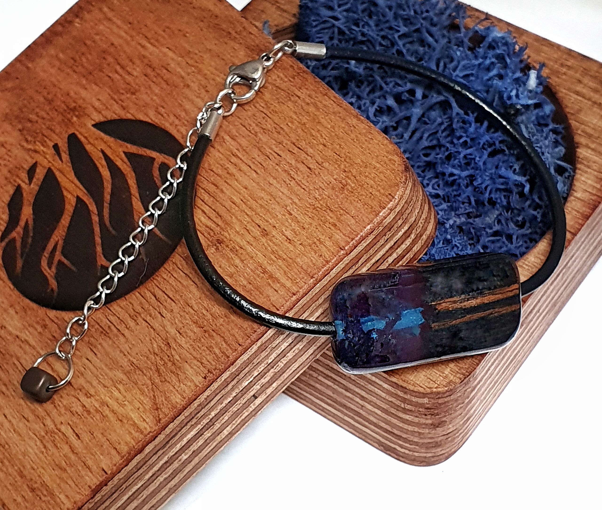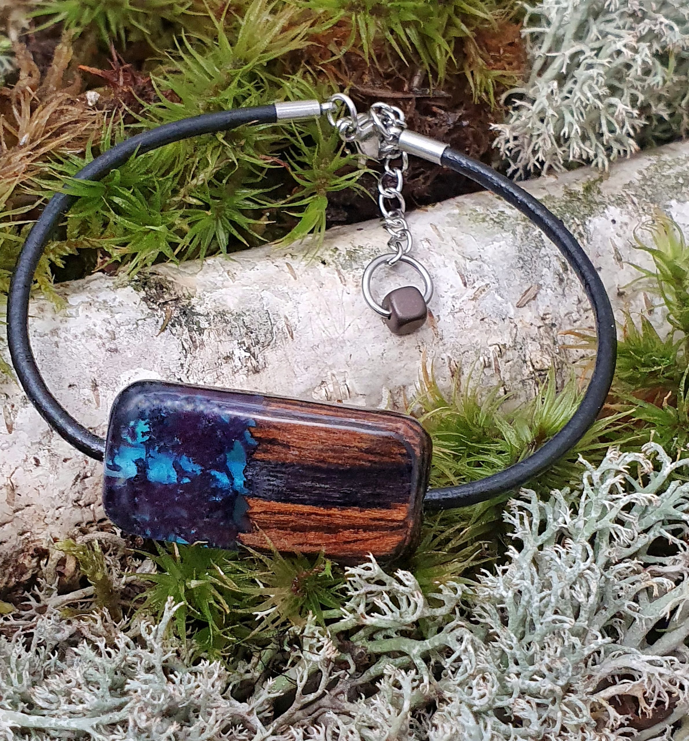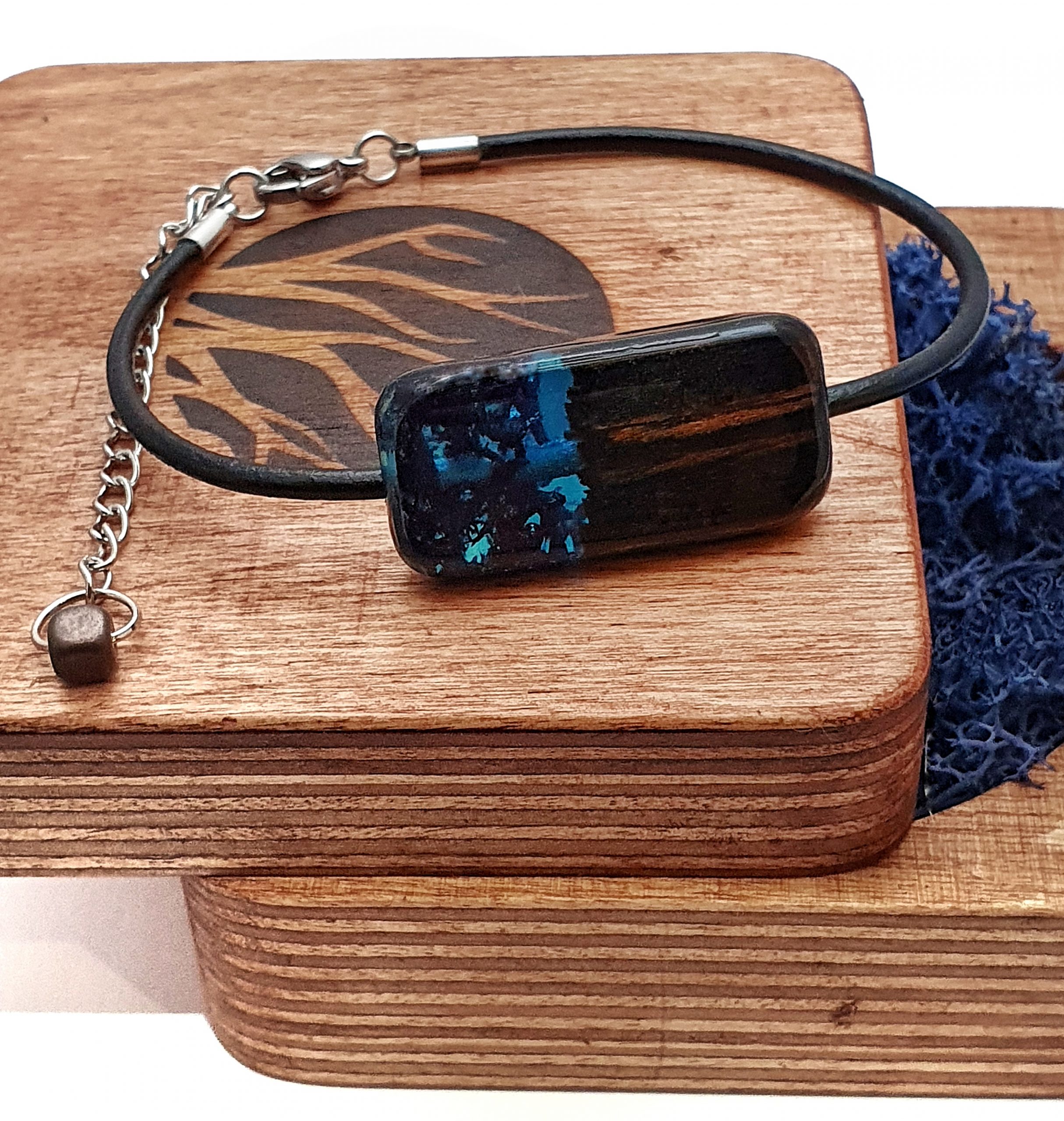 Oryginalna bransoletka z drewna palisandra połączonego z mchem islandzkim zatopionym w granatowej żywicy na bazie bio-komponentów.