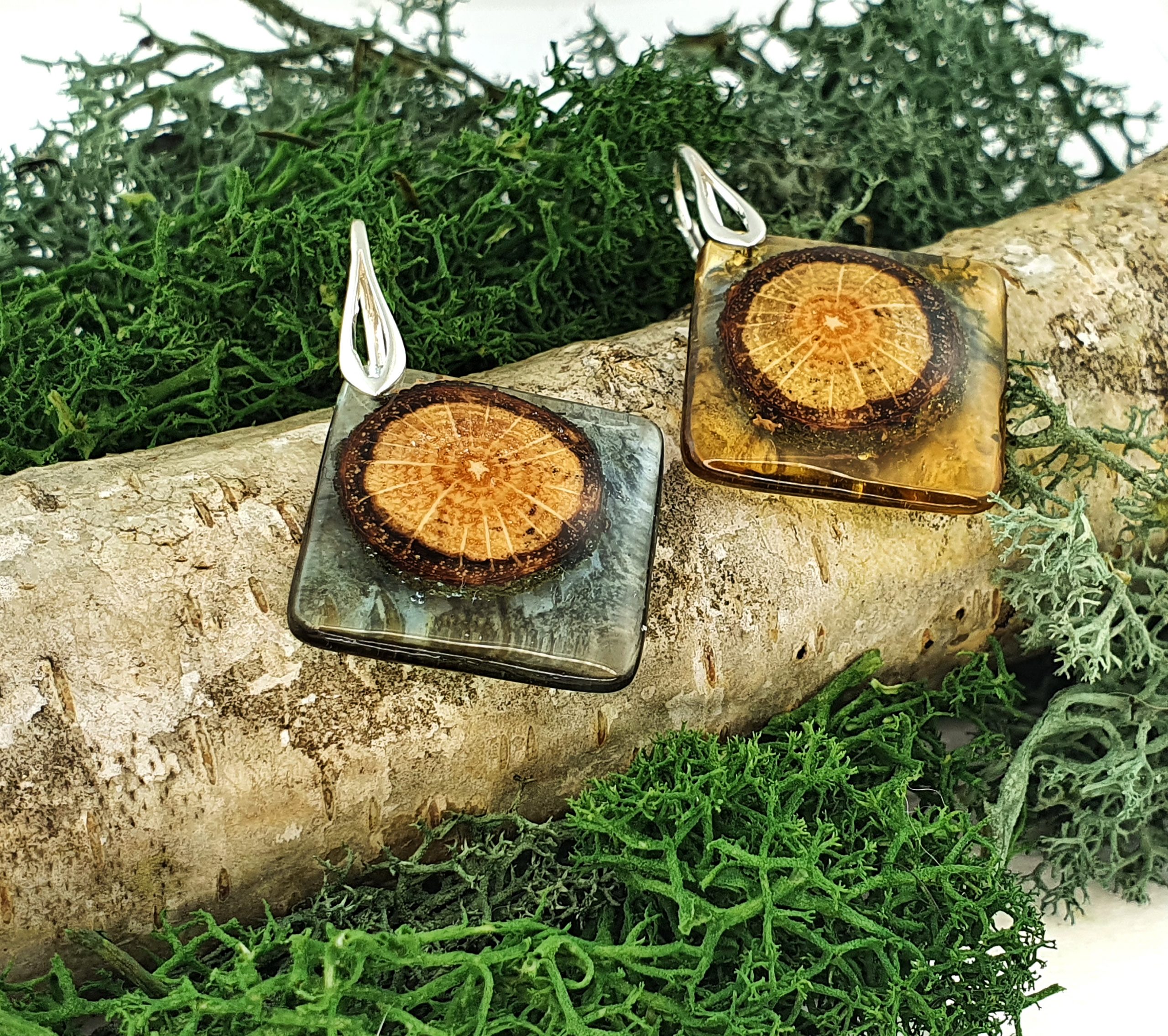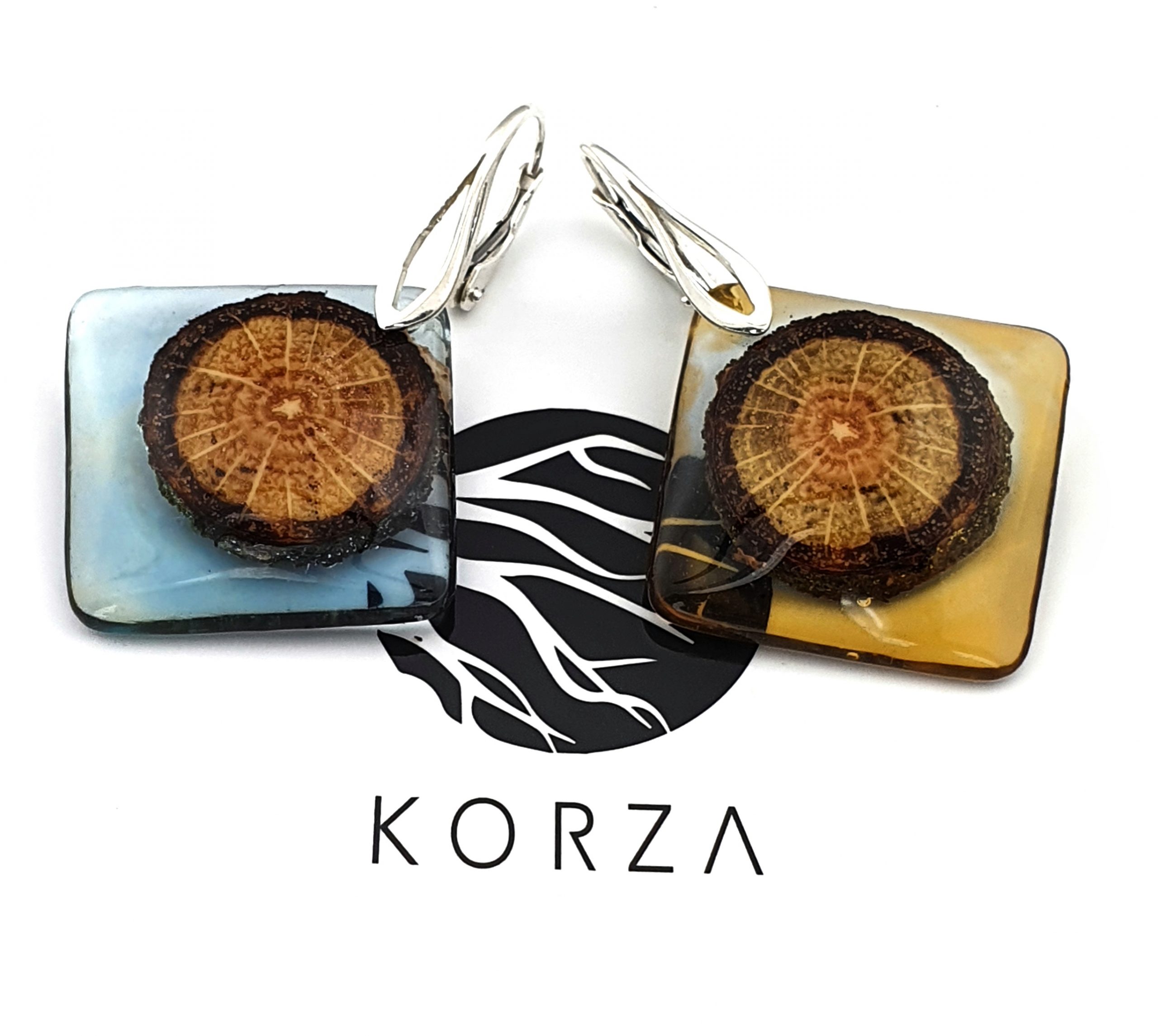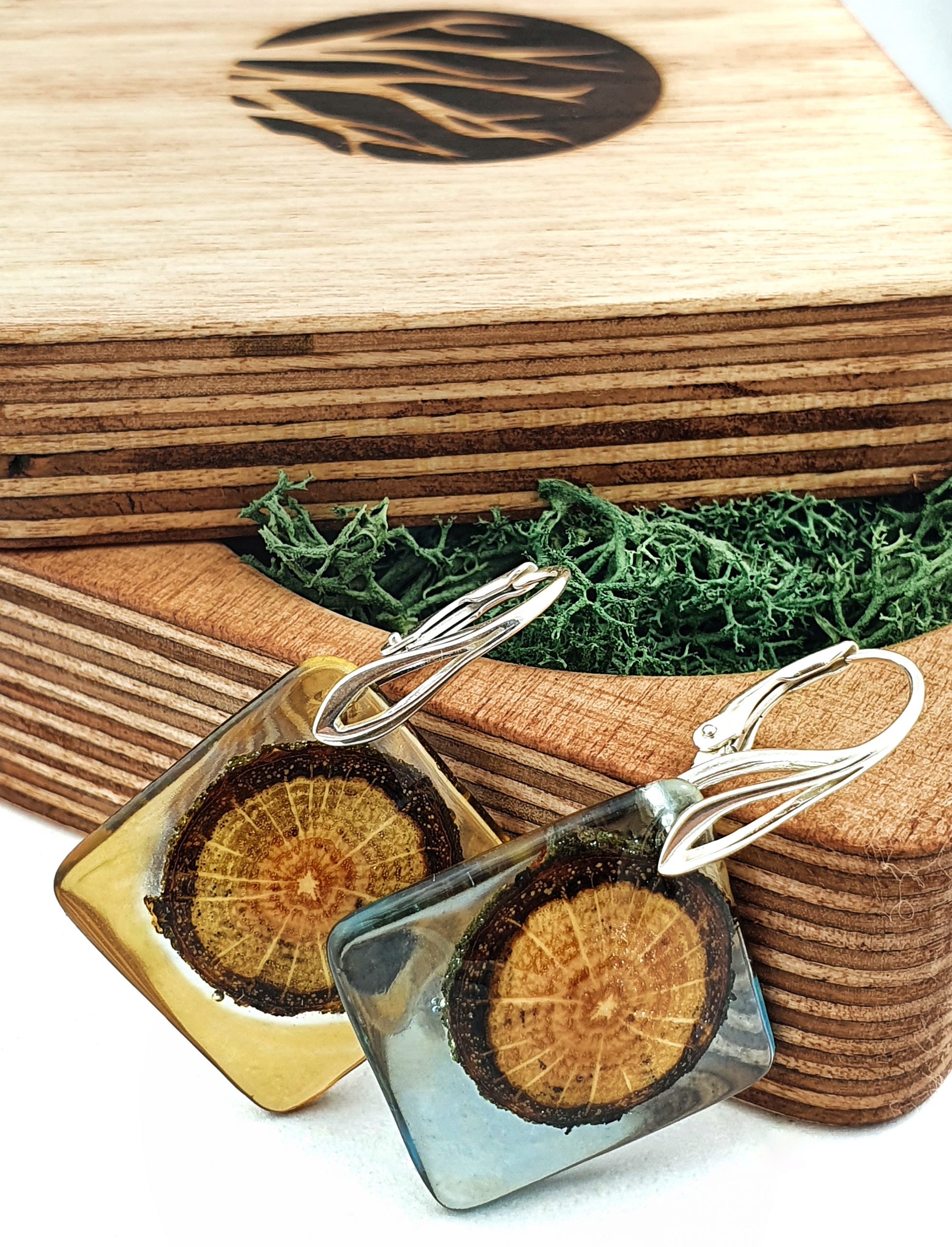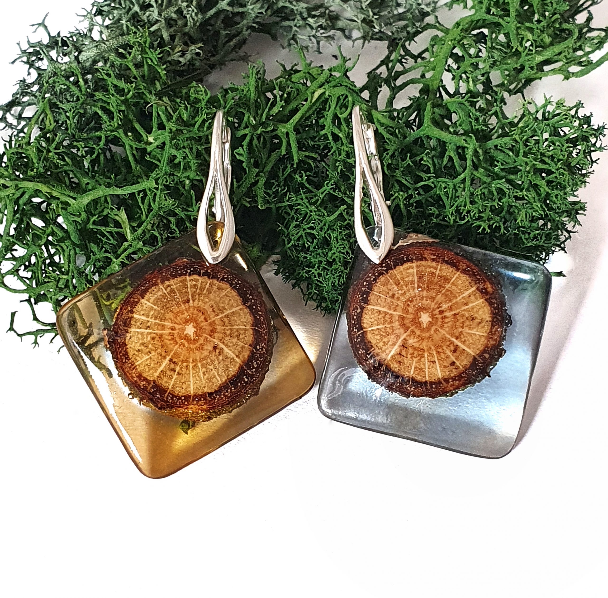 Inspirowane naturą, niepowtarzalne kolczyki z drewna dębu połączonego z barwioną żywicą na bazie bio-komponentów.