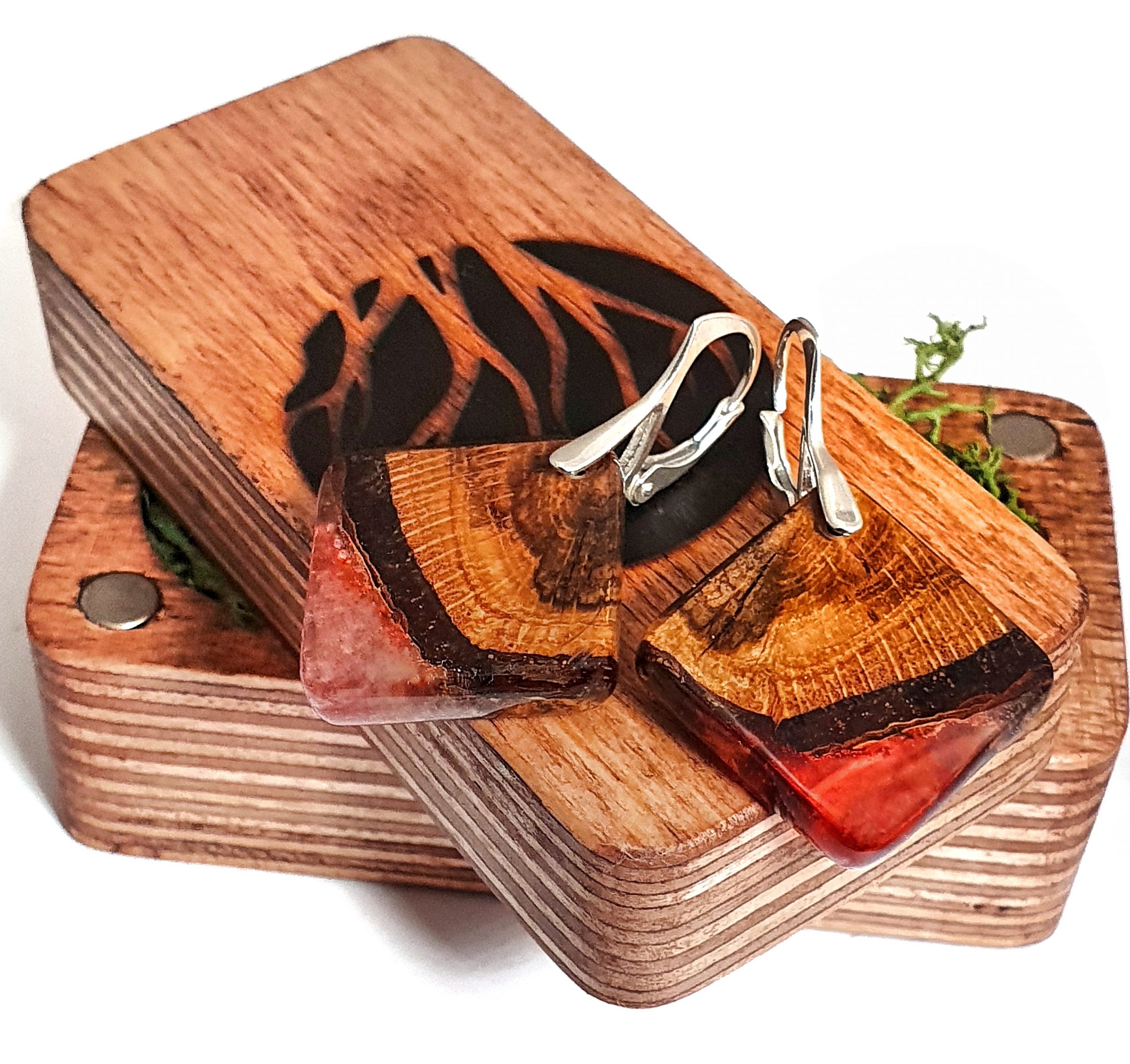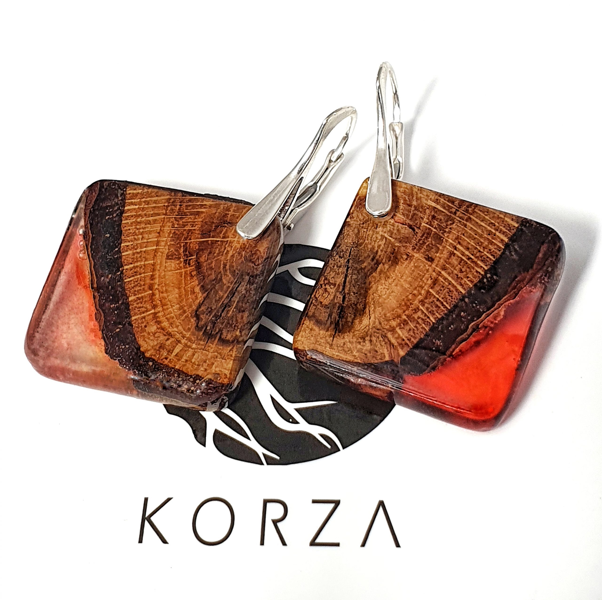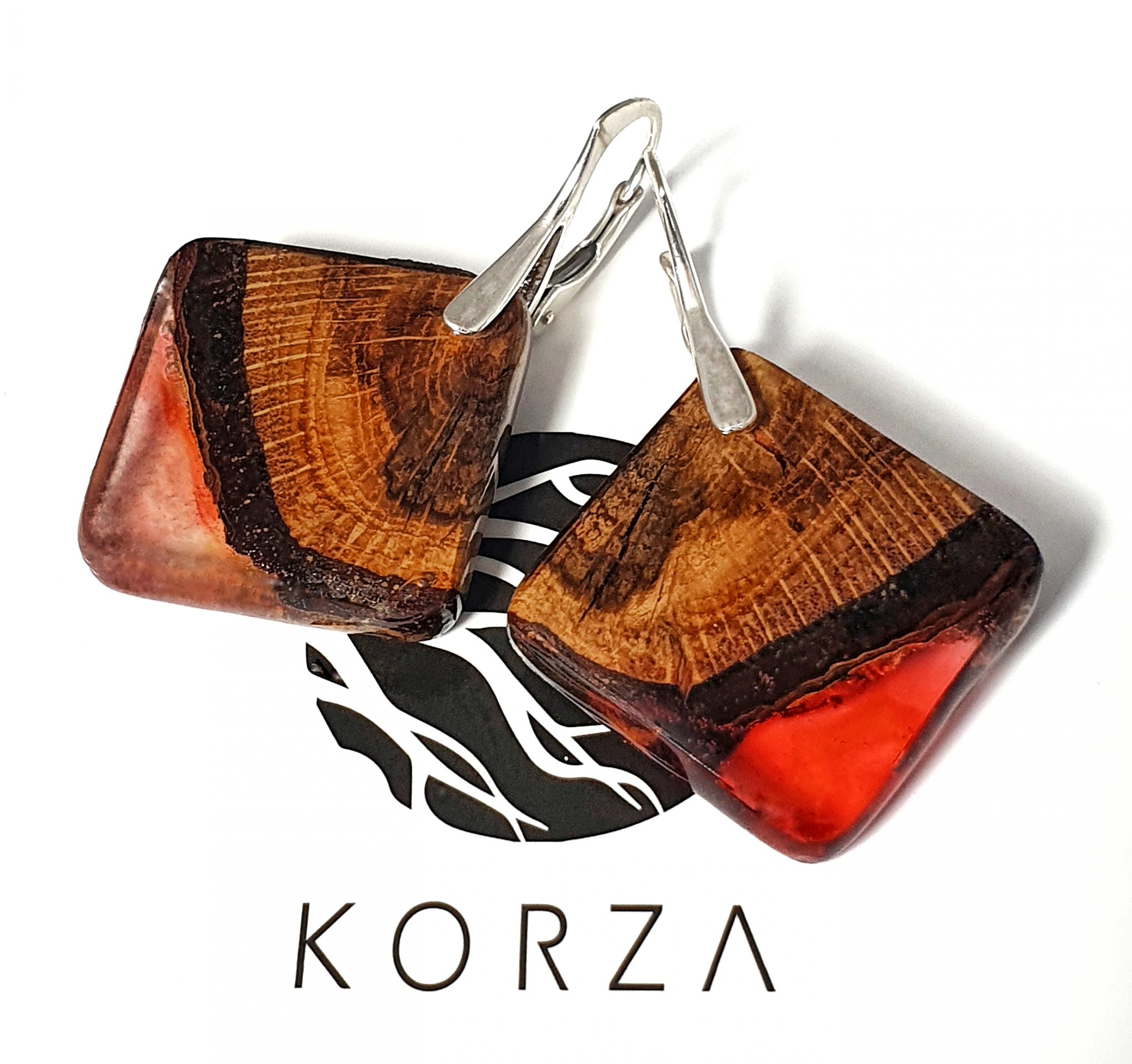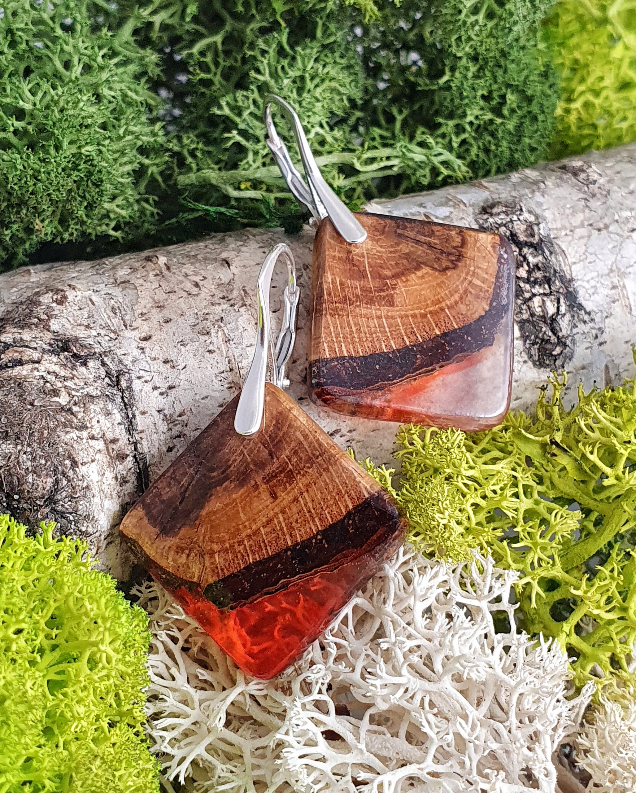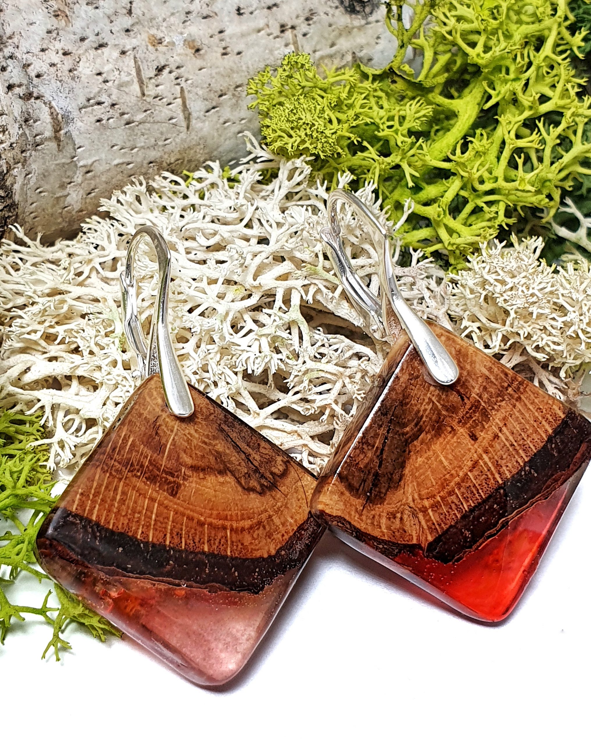 Oryginalne i niepowtarzalne kolczyki z drewna dębu połączonego z barwioną żywicą na bazie bio-komponentów.