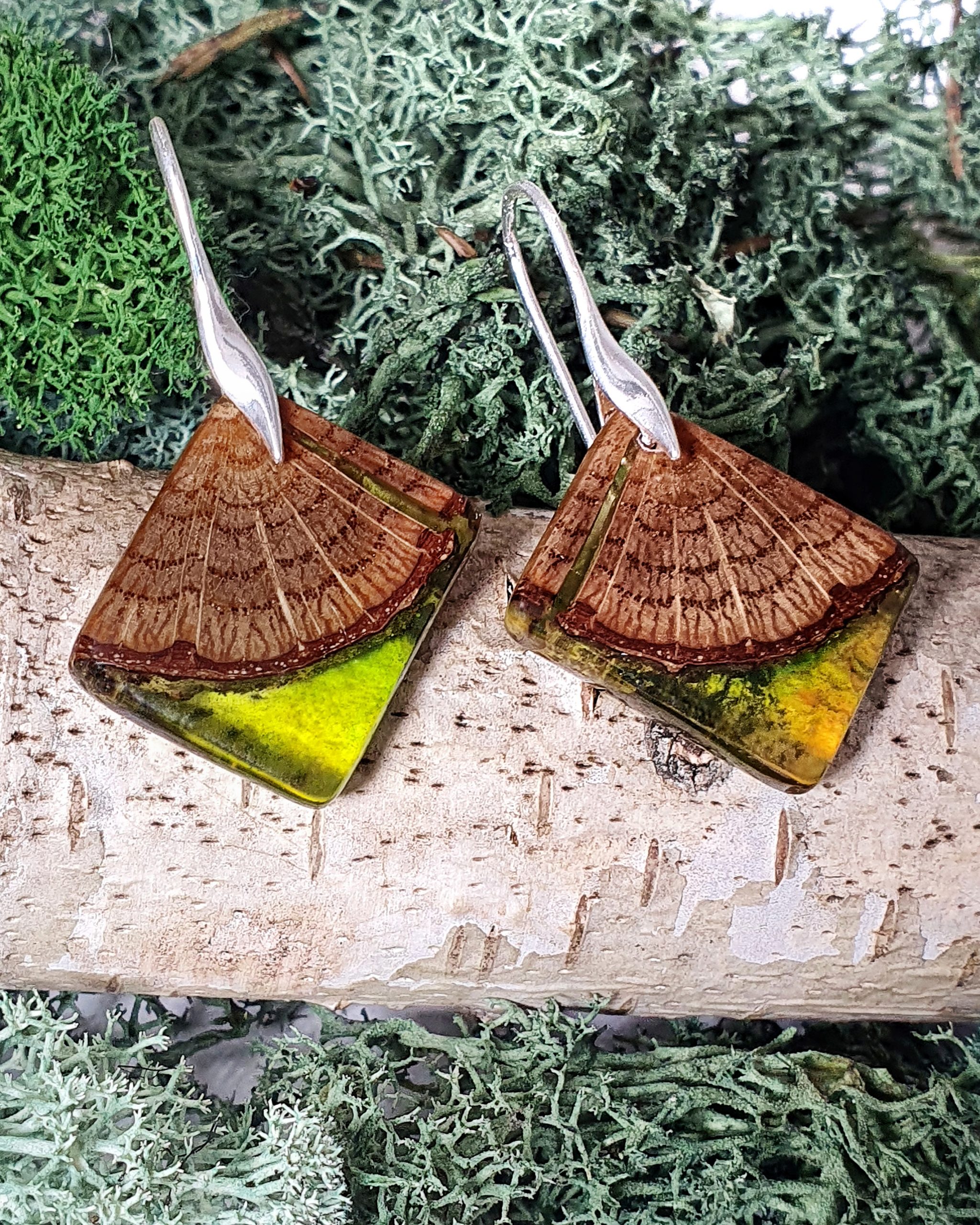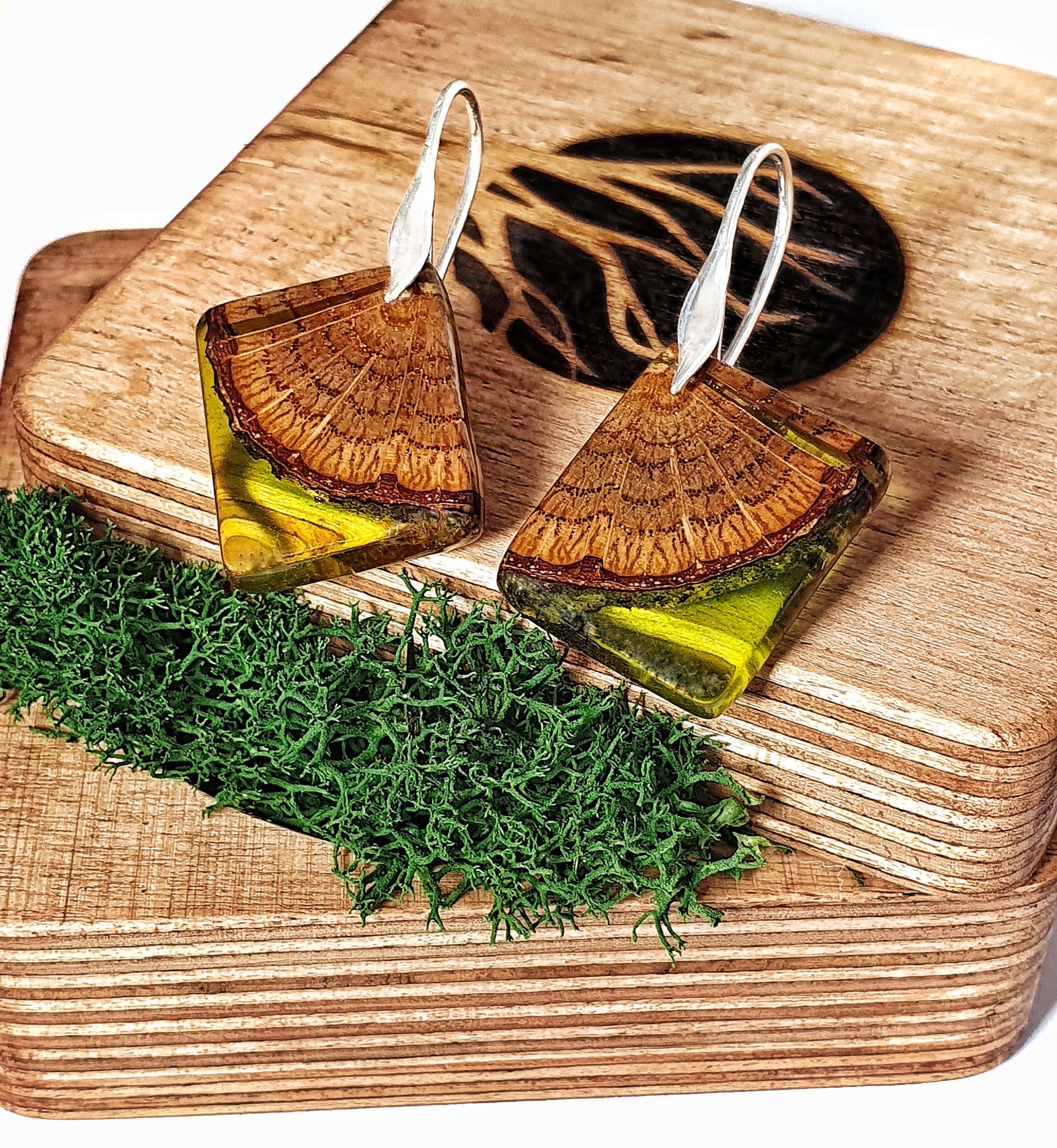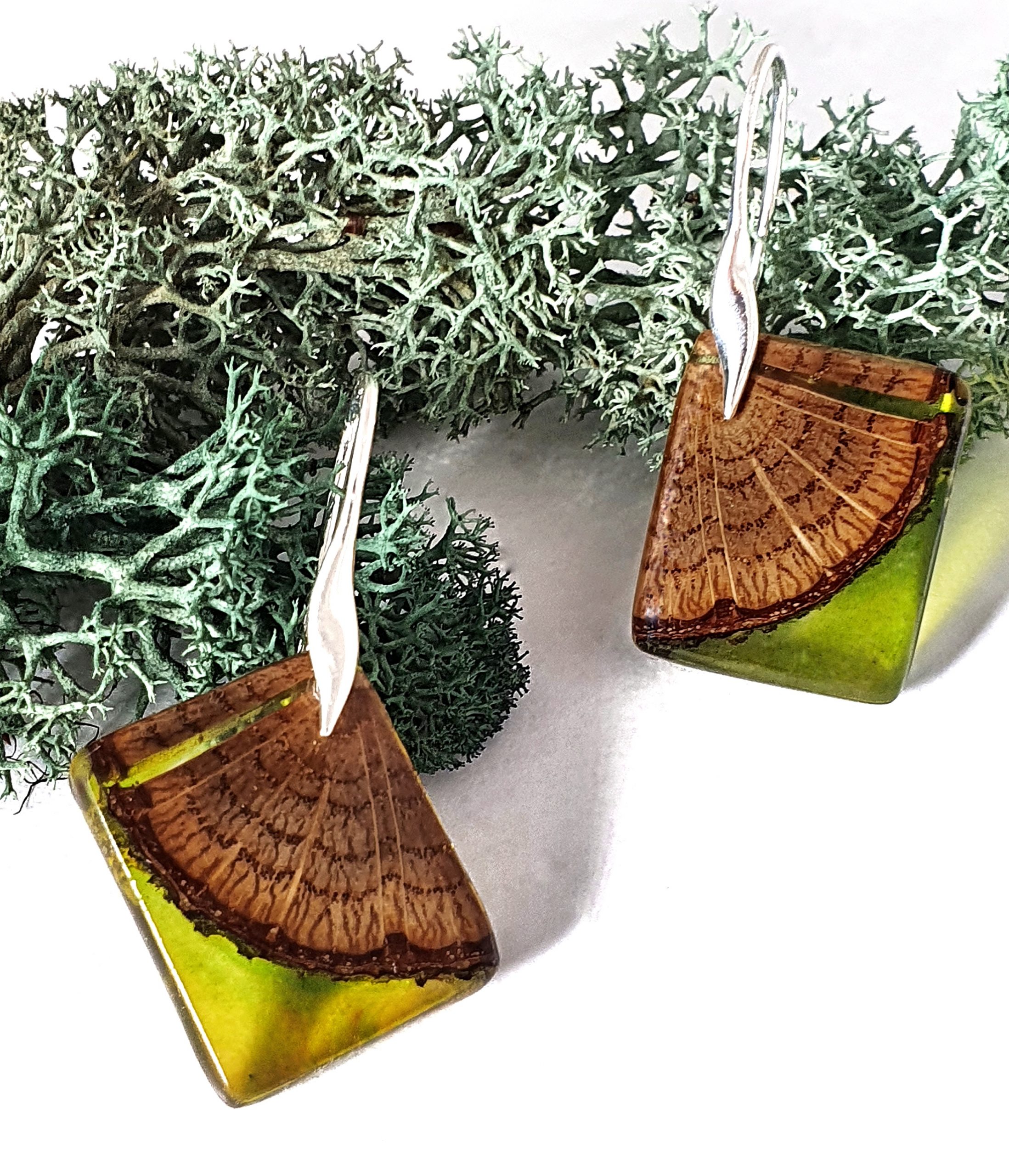 Asymetryczne, niepowtarzalne kolczyki z drewna dębu połączonego z barwioną żywicą na bazie bio-komponentów.