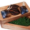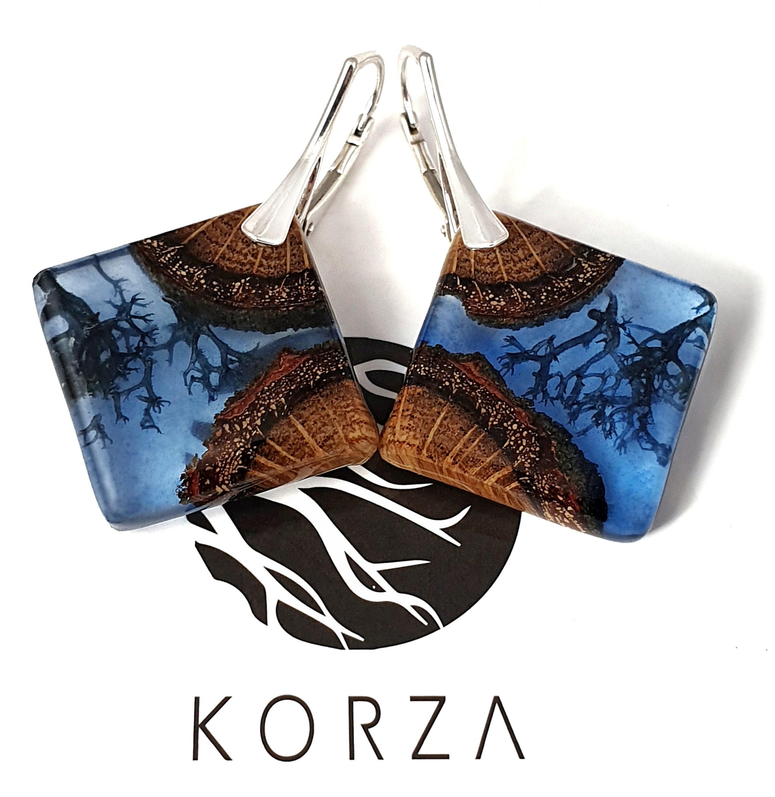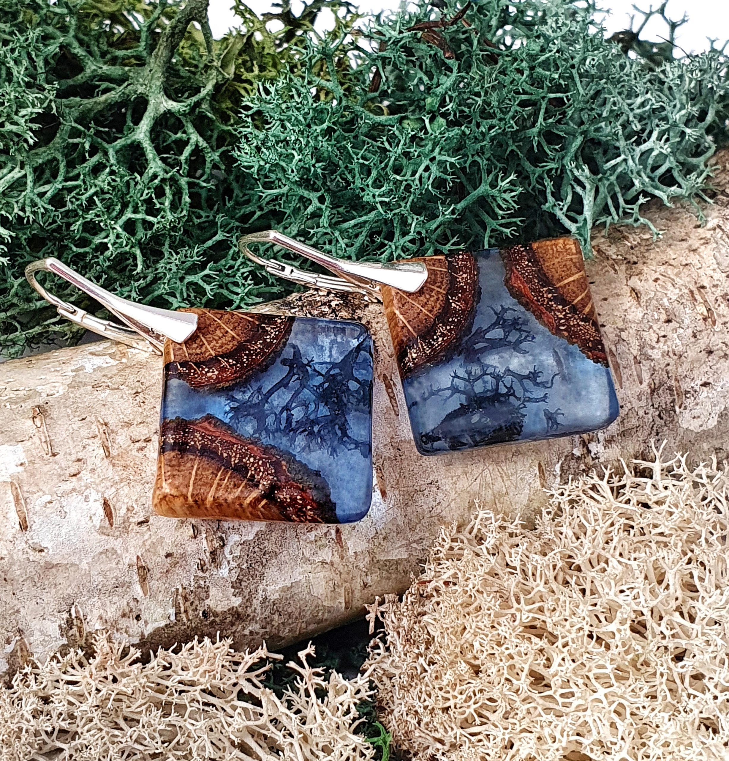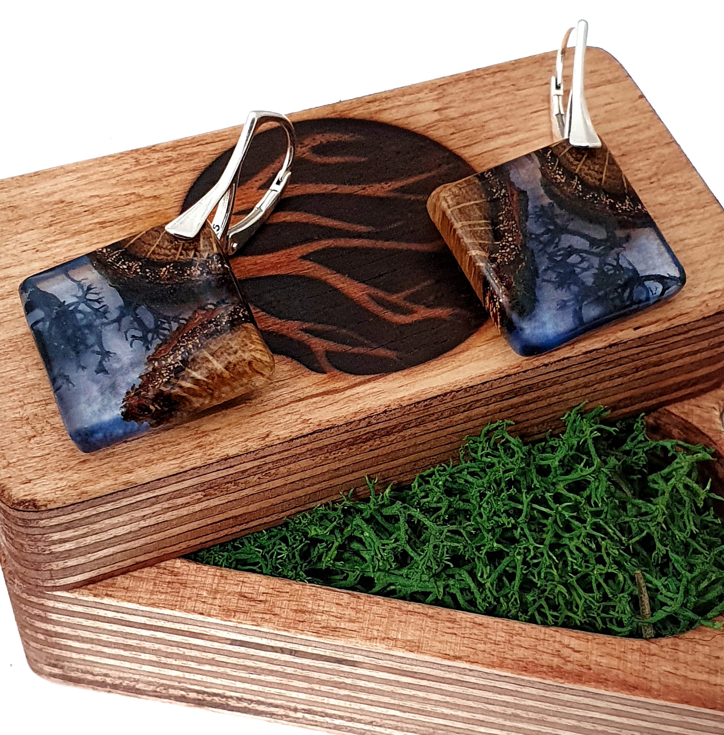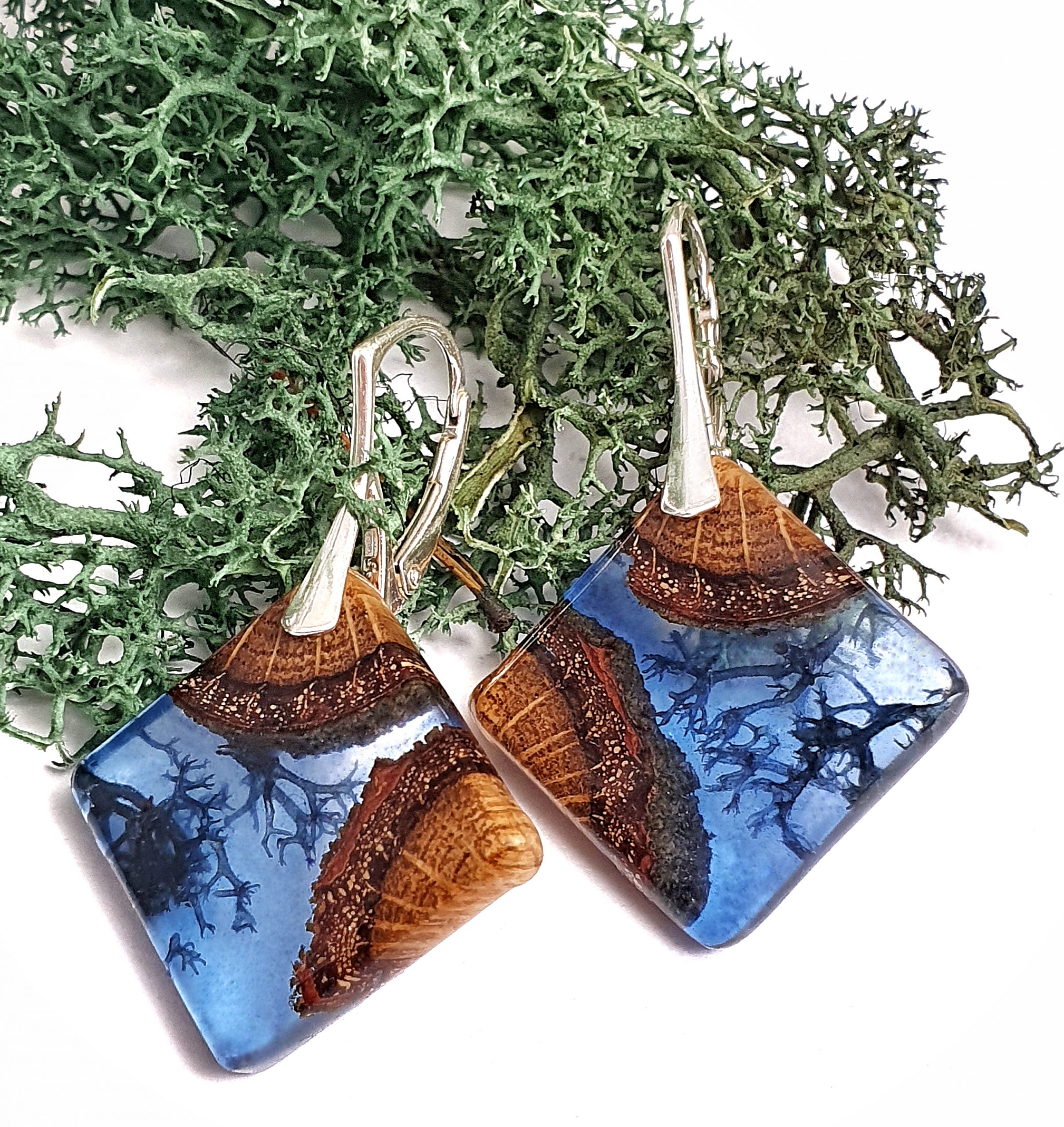 Niepowtarzalne kolczyki z drewna dębu połączonego z granatowym mchem islandzkim oraz barwioną żywicą na bazie bio-komponentów.