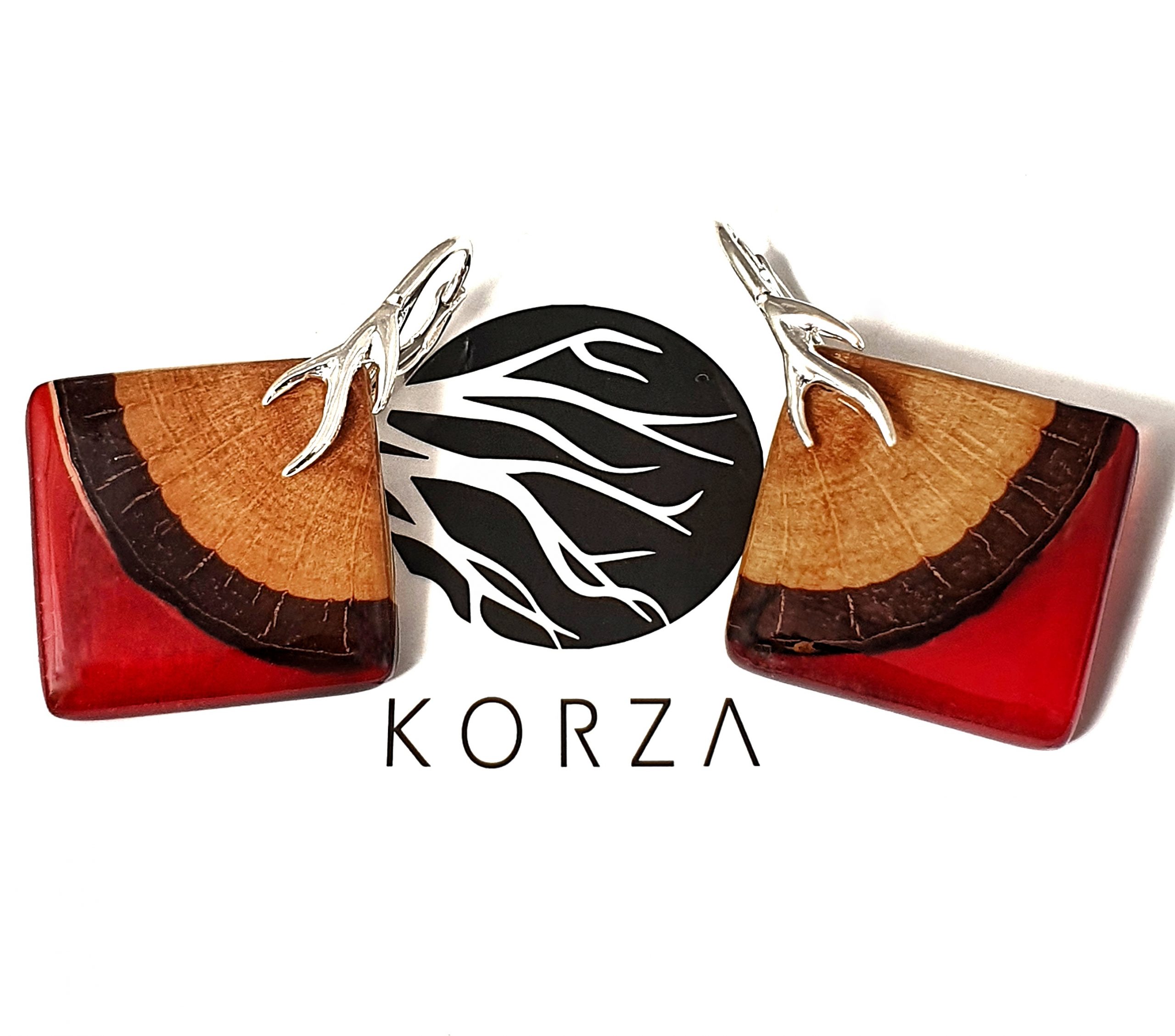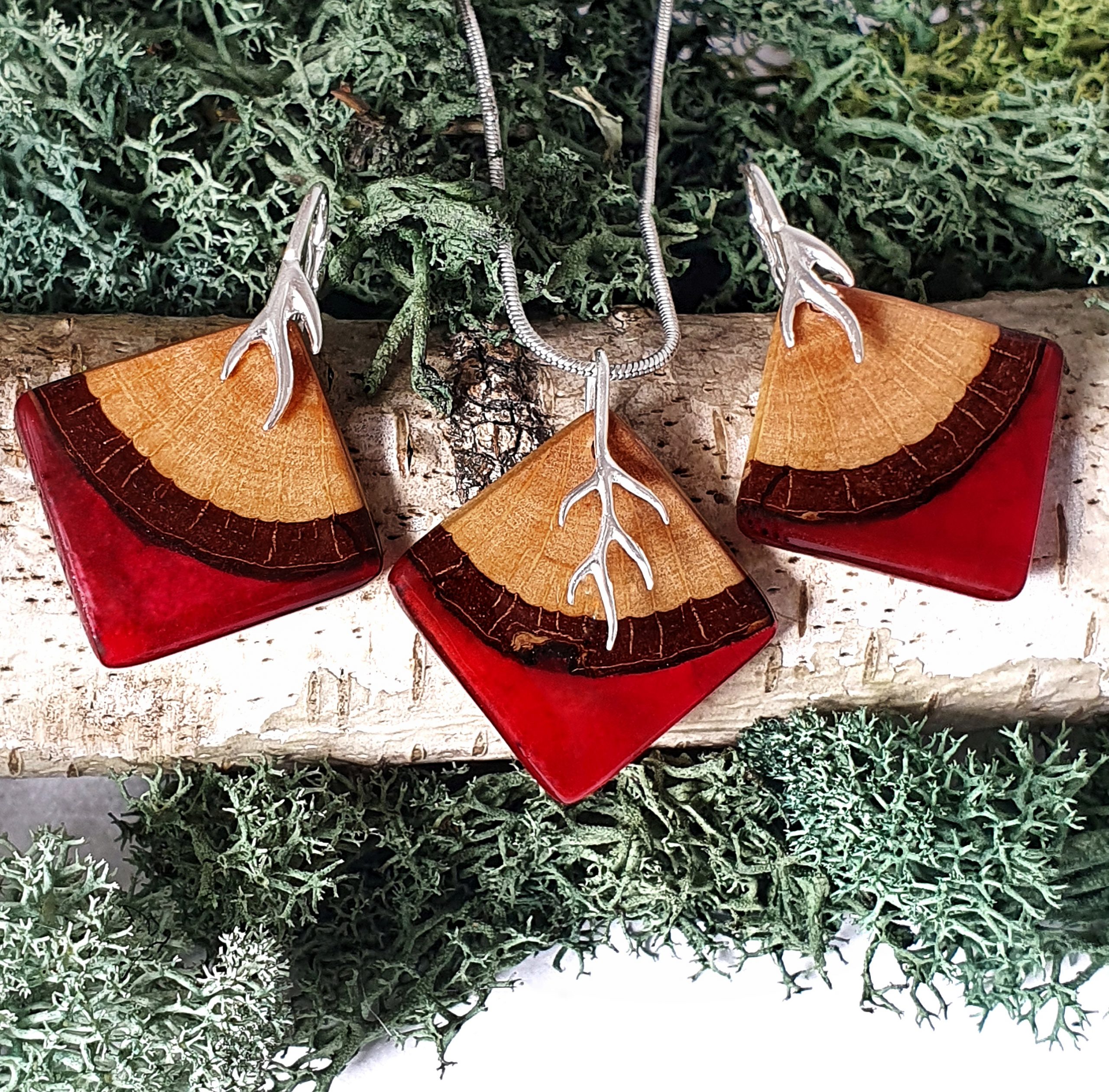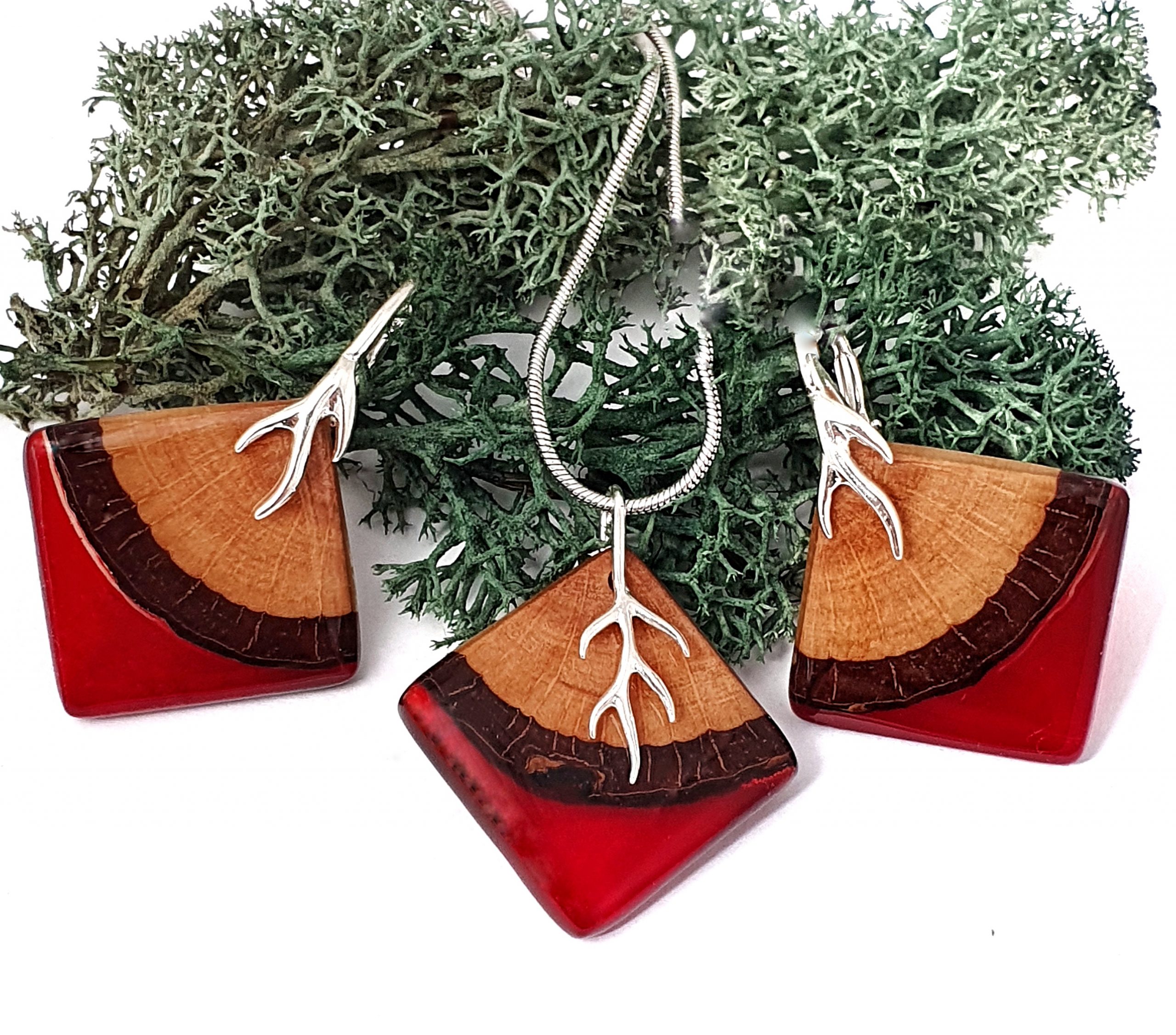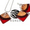 Komplet biżuterii z pięknego, naturalnego drewna akacji i żywicy na bazie bio-komponentów w odcieniu głębokiej czerwieni.