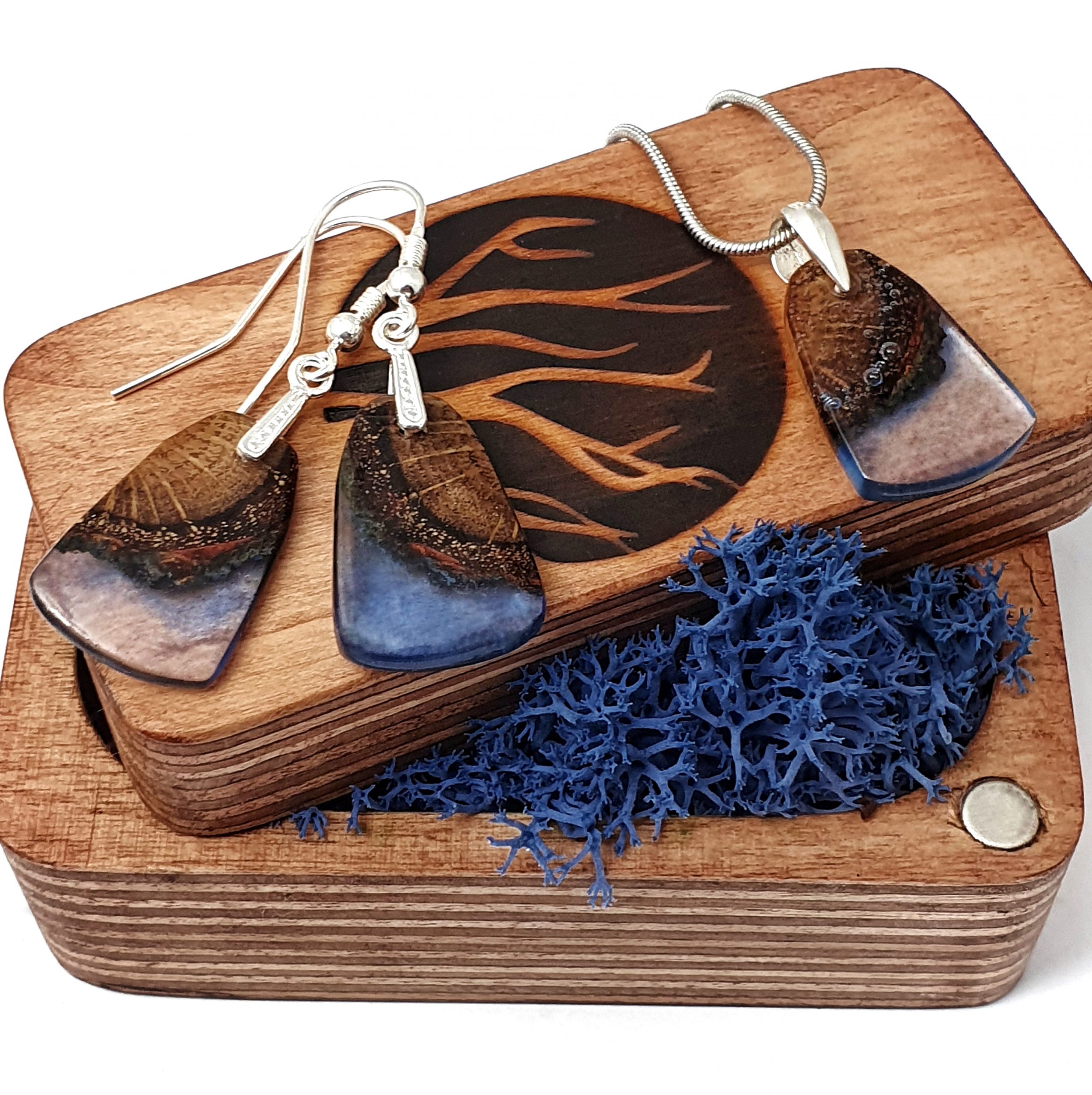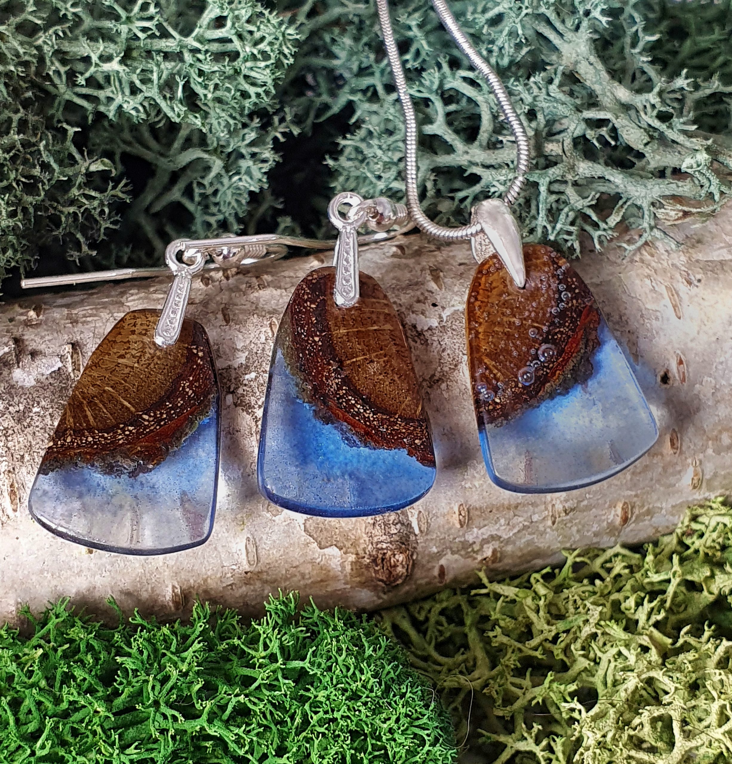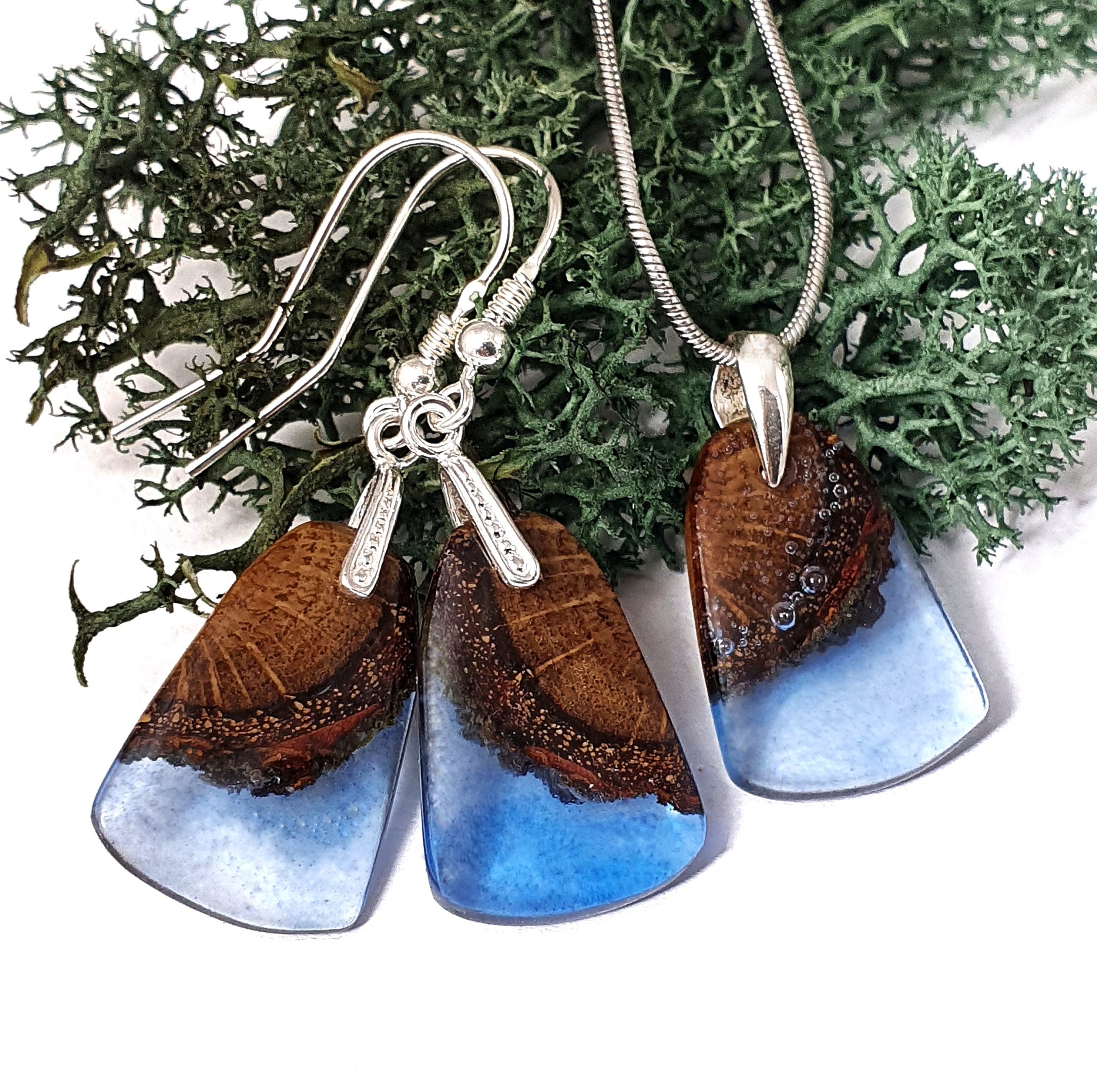 Komplet biżuterii z pięknego, naturalnego drewna dębu i błękitnej żywicy na bazie bio-komponentów.
