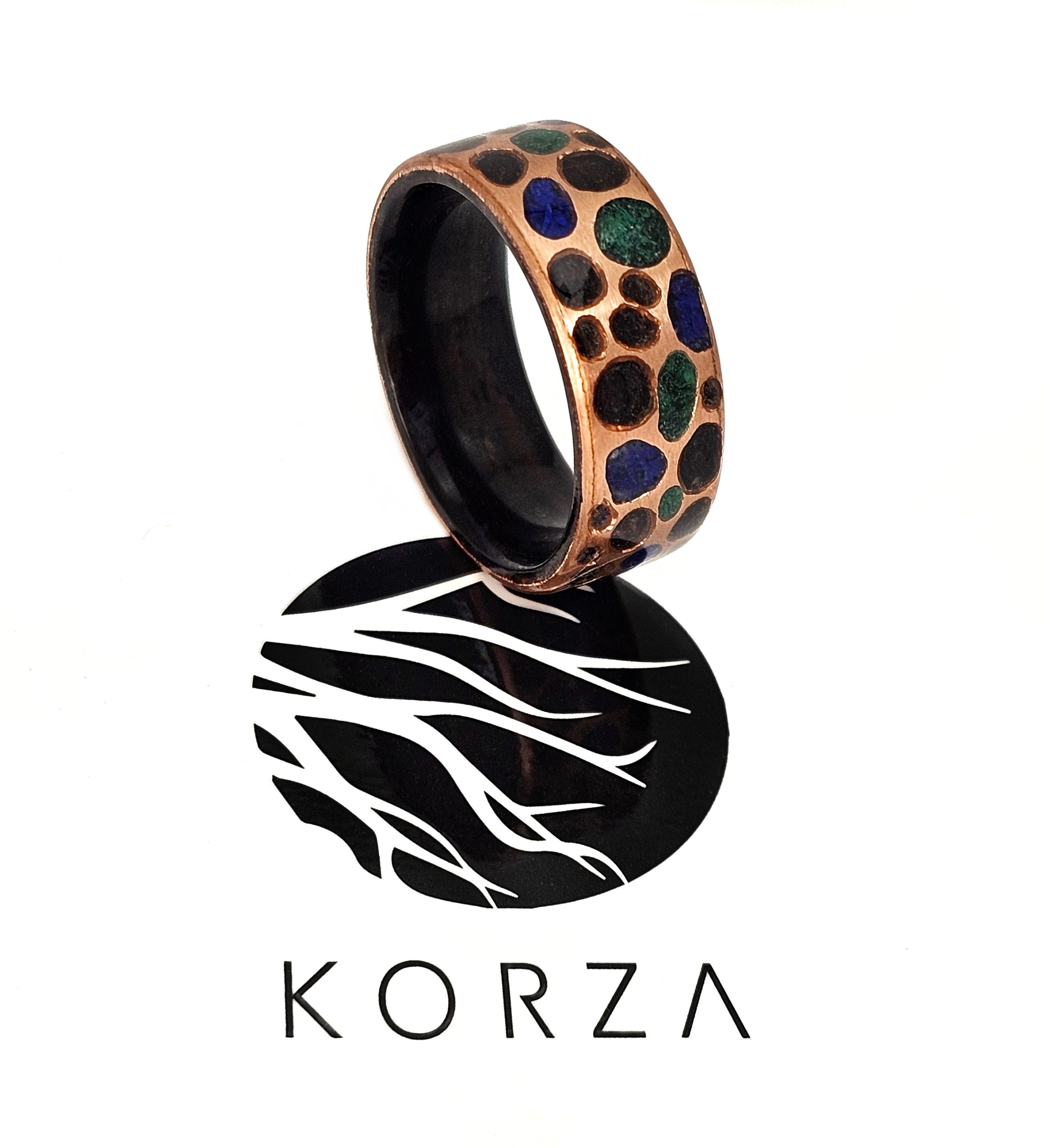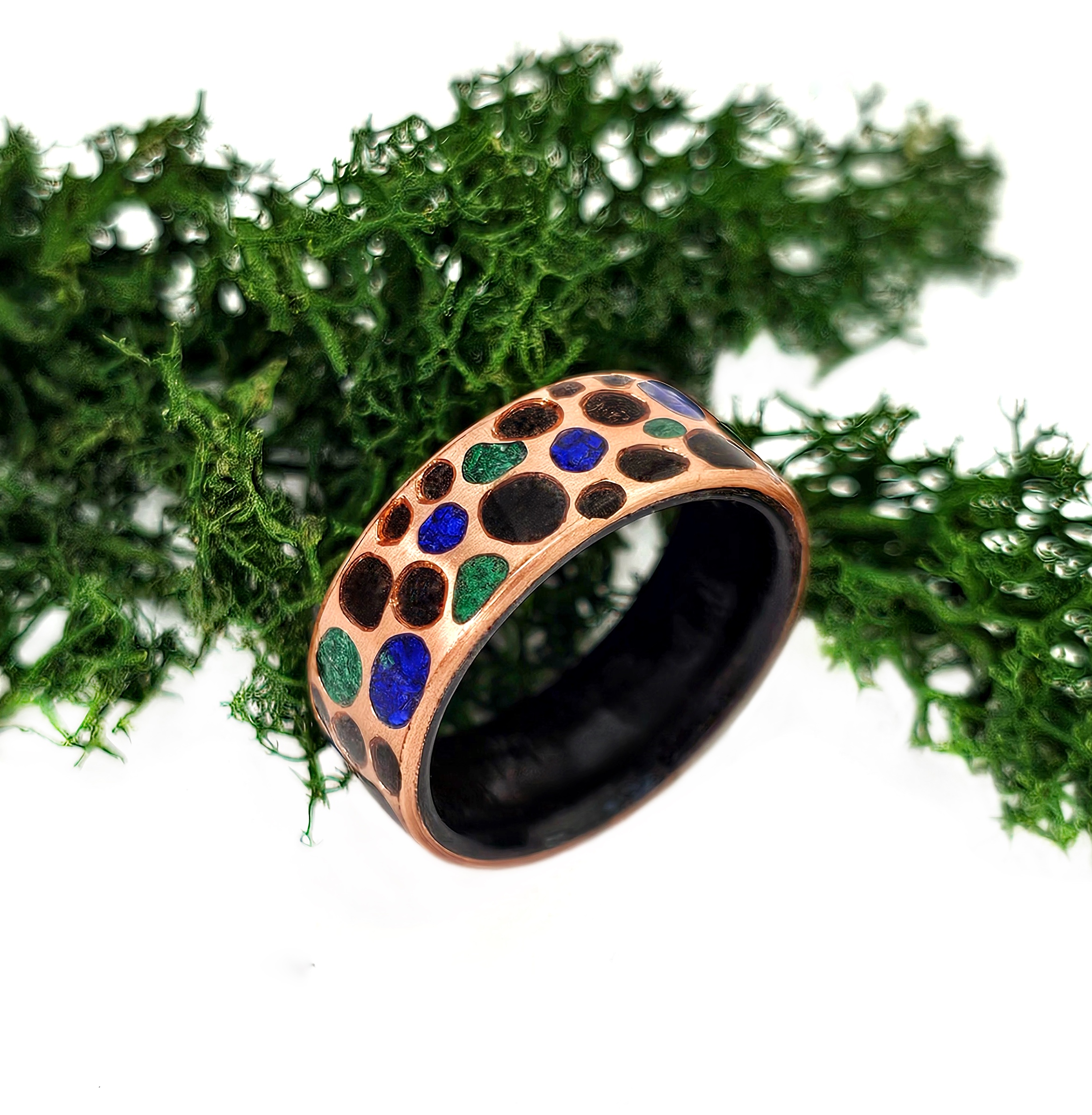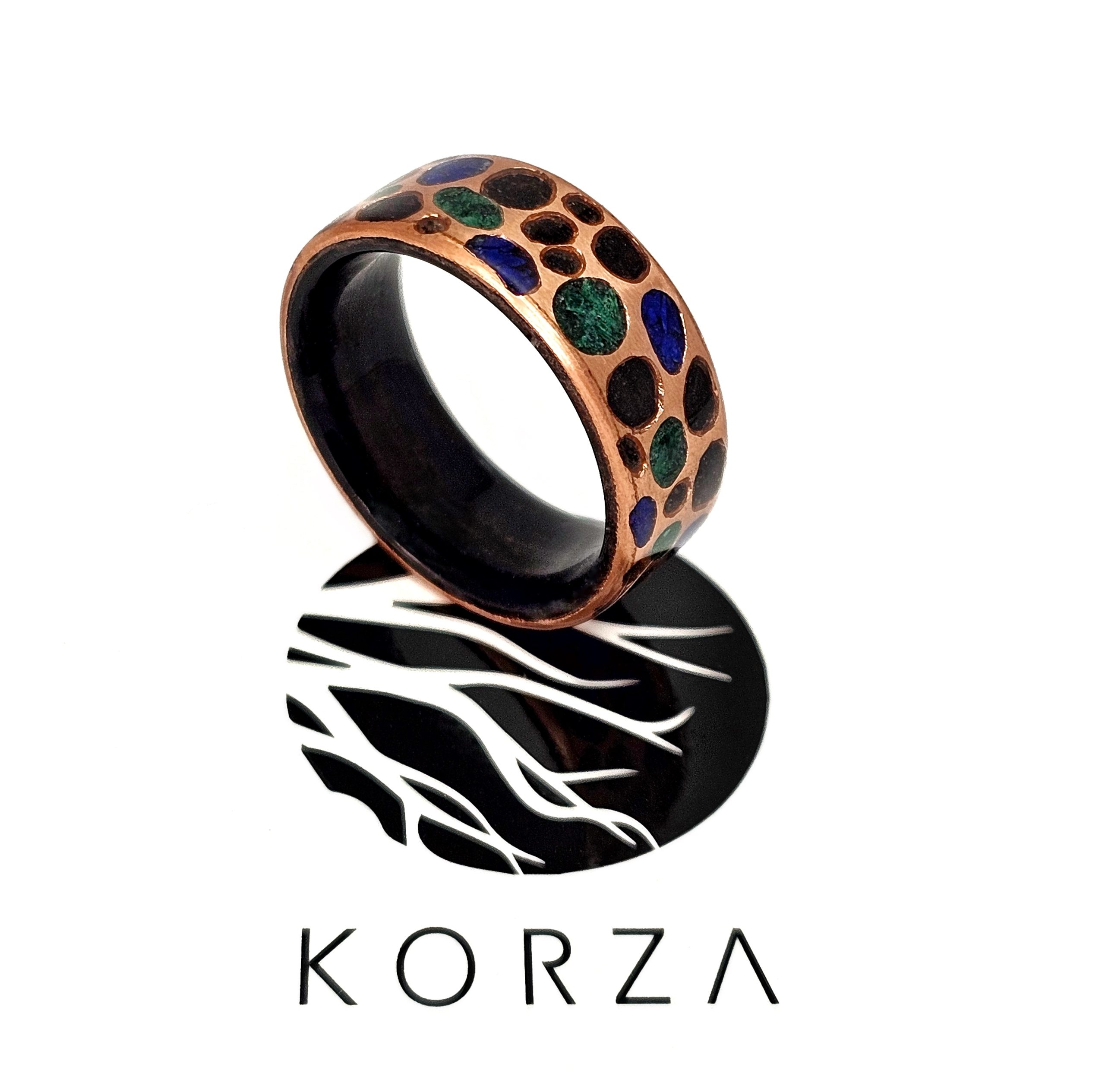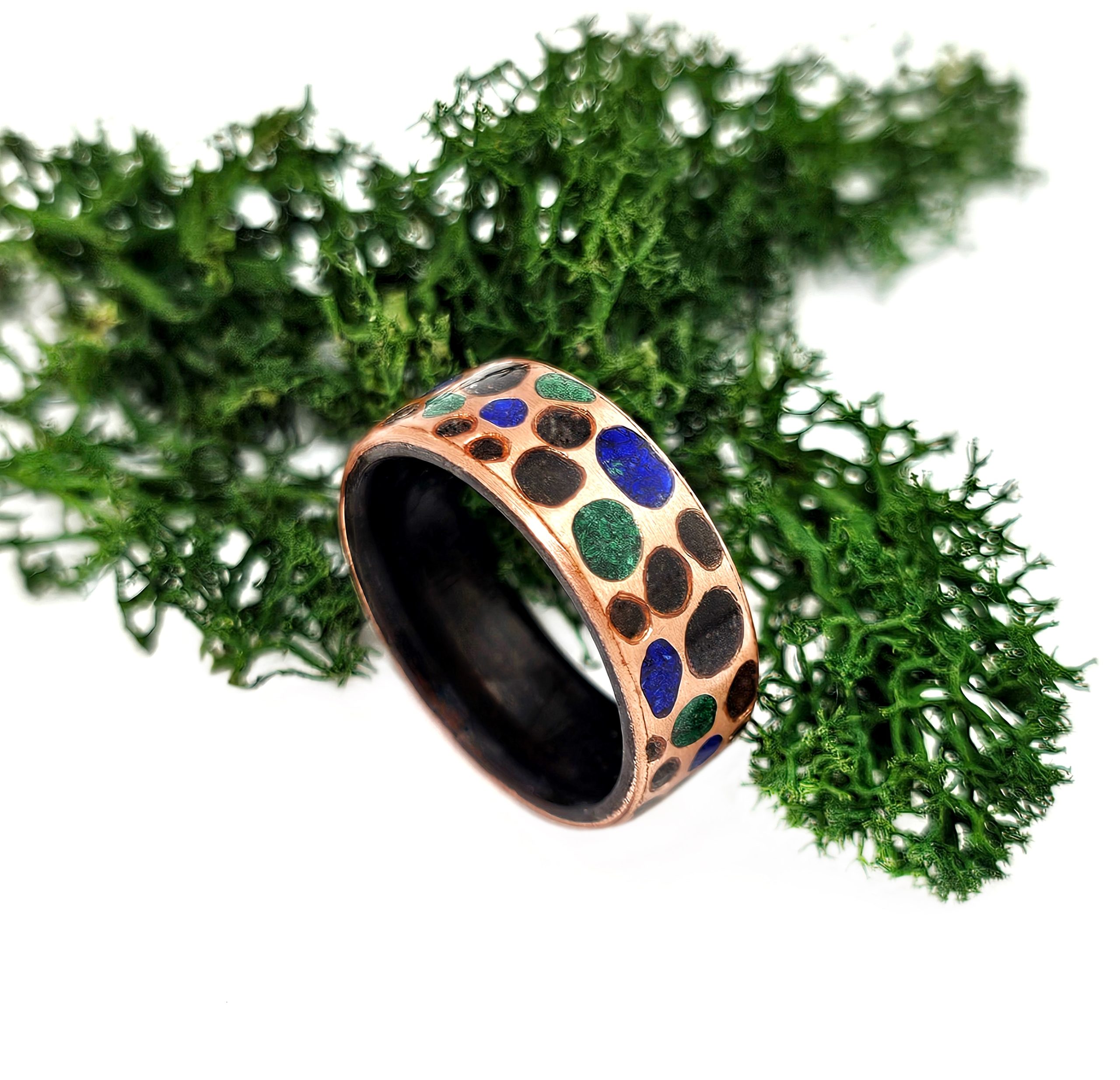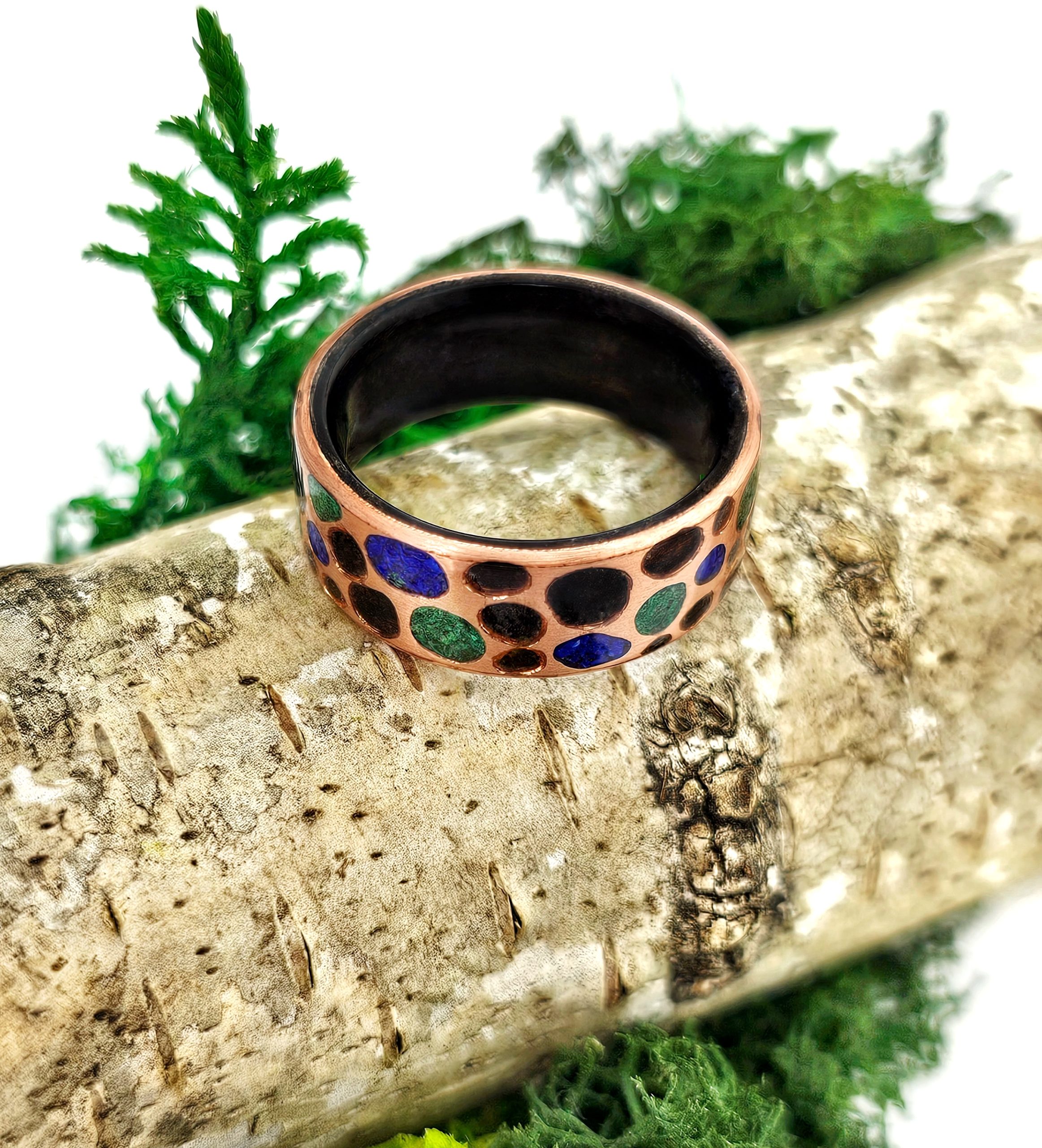 Pierścionek z drewna wenge, miedzi i kamieni półszlachetnych – ręczne rzemiosło z duszą.