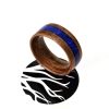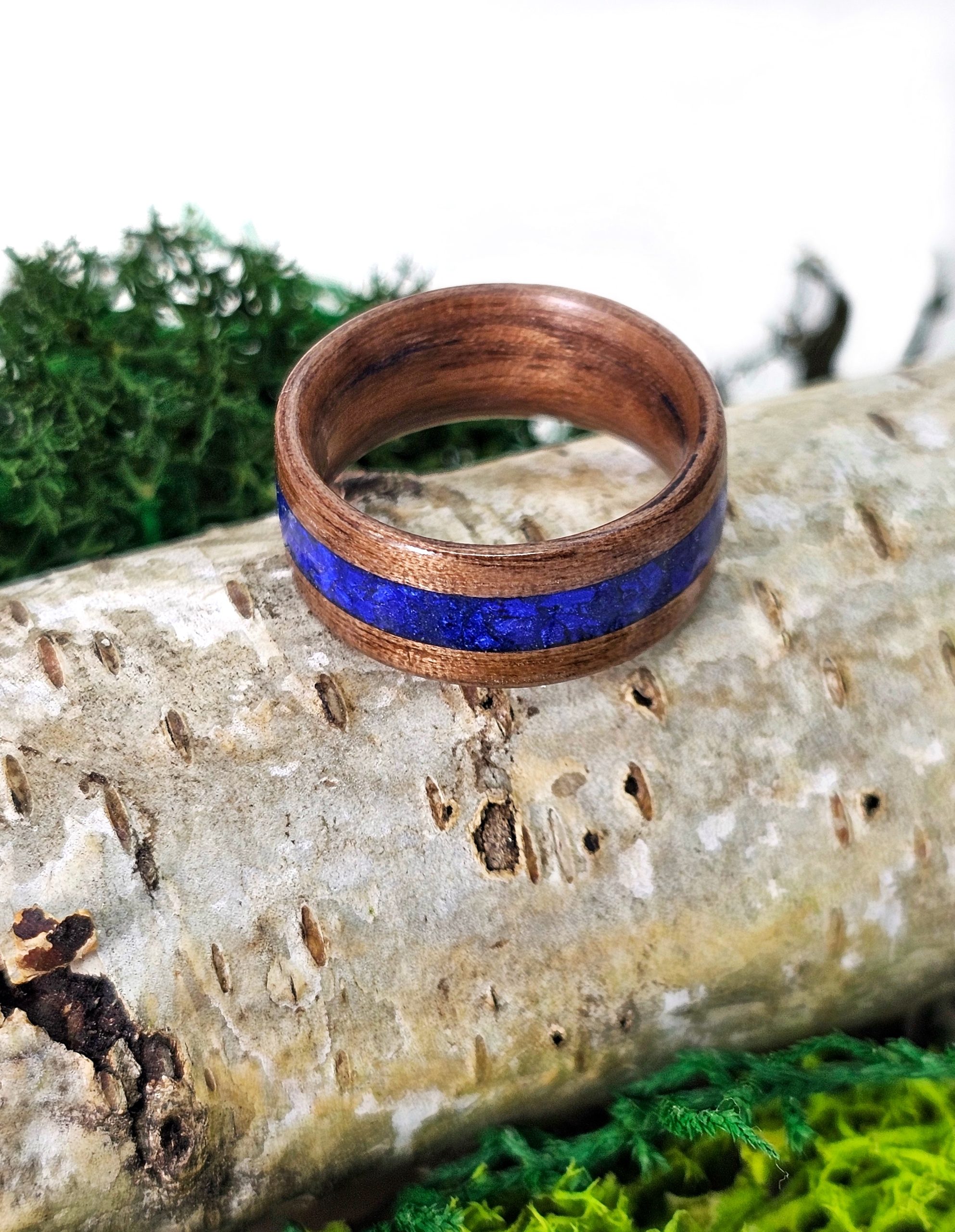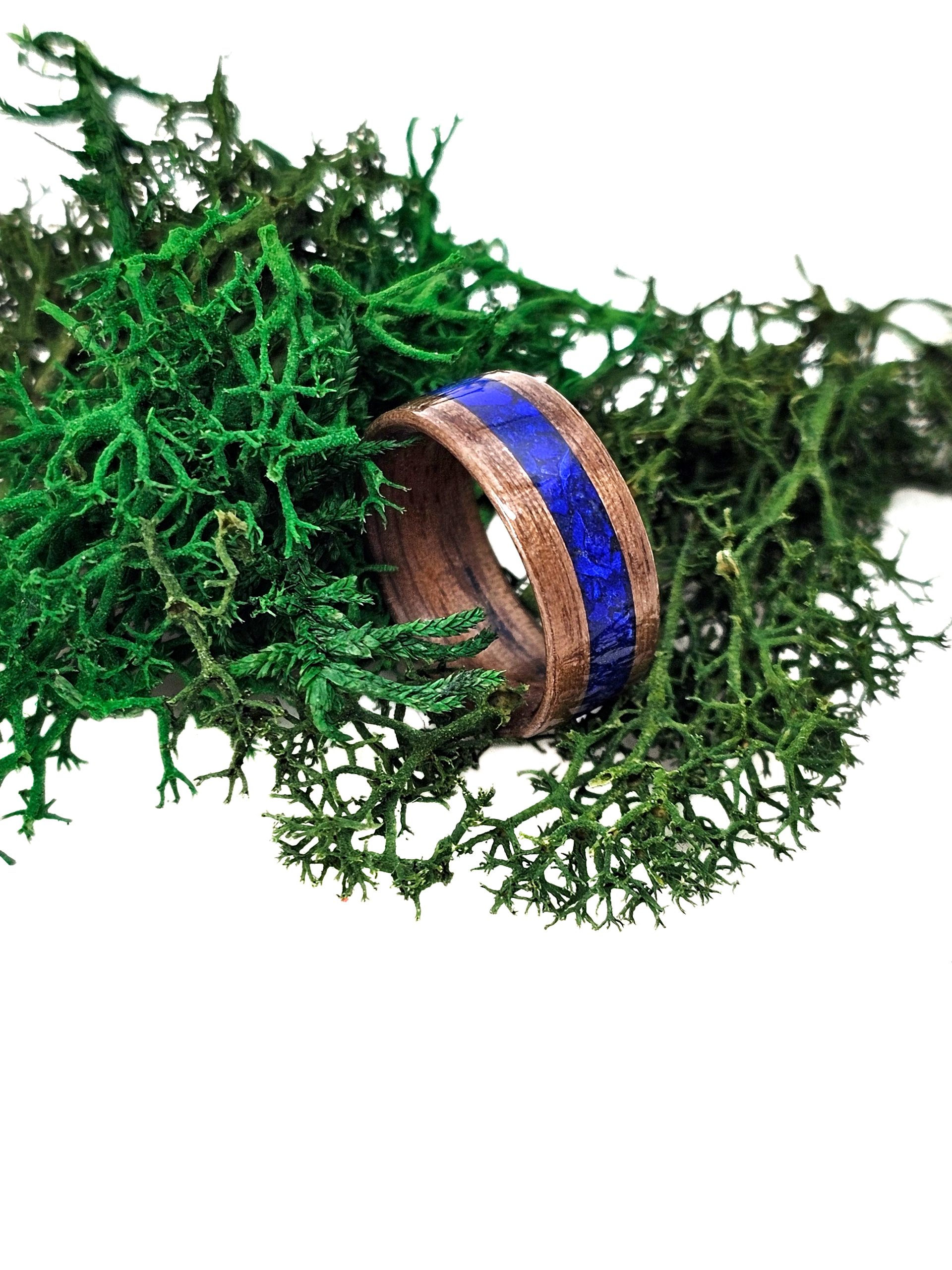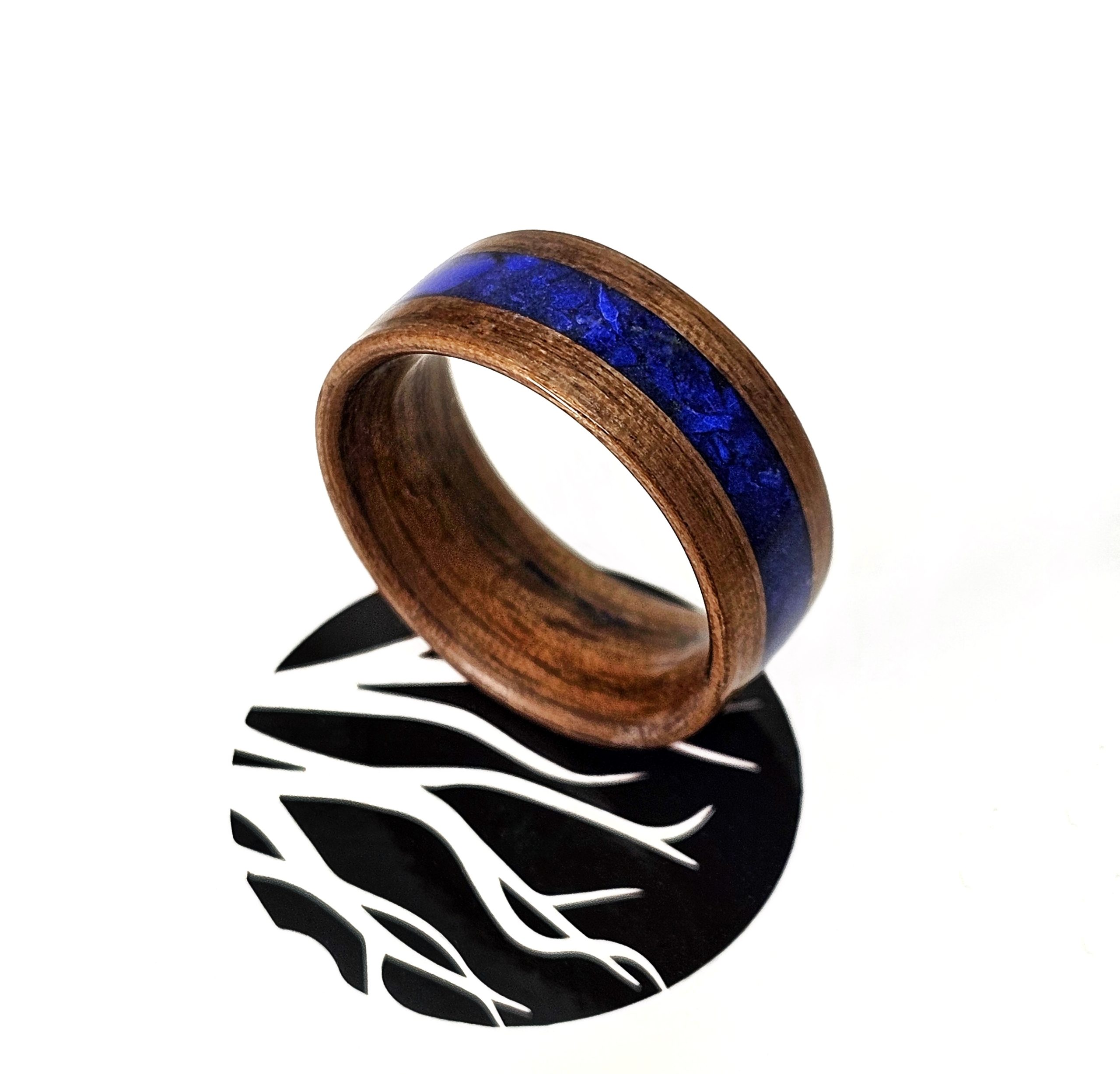 Wyjątkowy pierścionek z drewna orzecha amerykańskiego, połączonego z minerałem – przepięknym kamieniem lapis lazuli, który jest połączeniem lazurytu, kalcytu i pirytu.