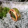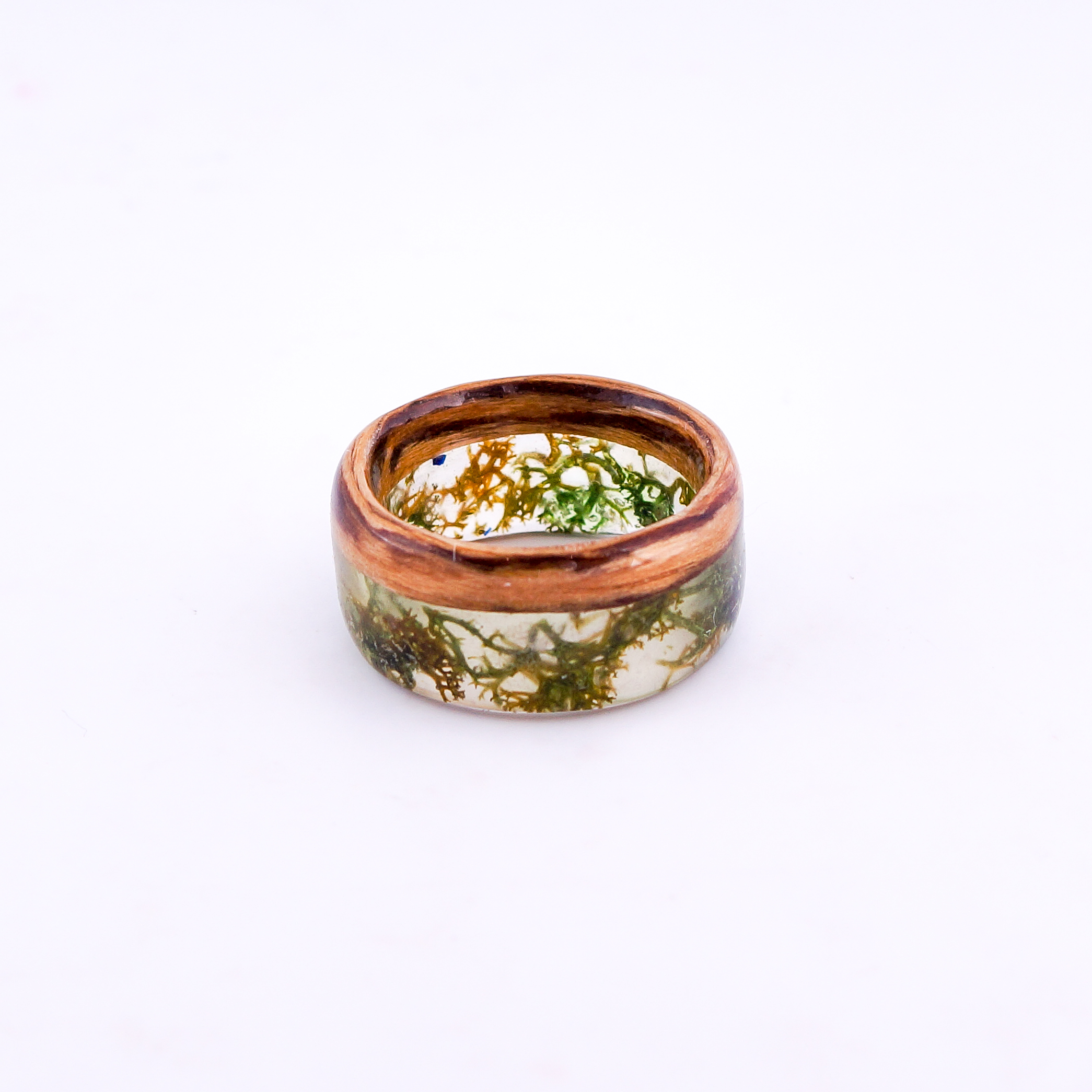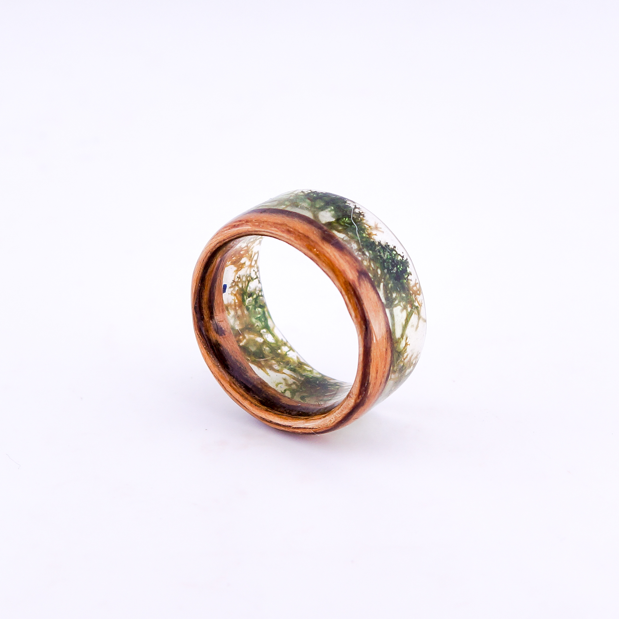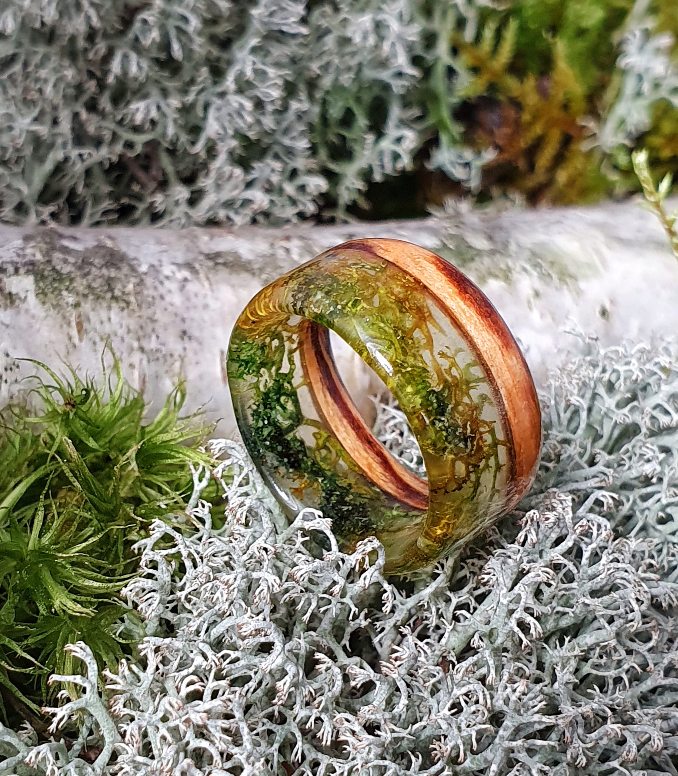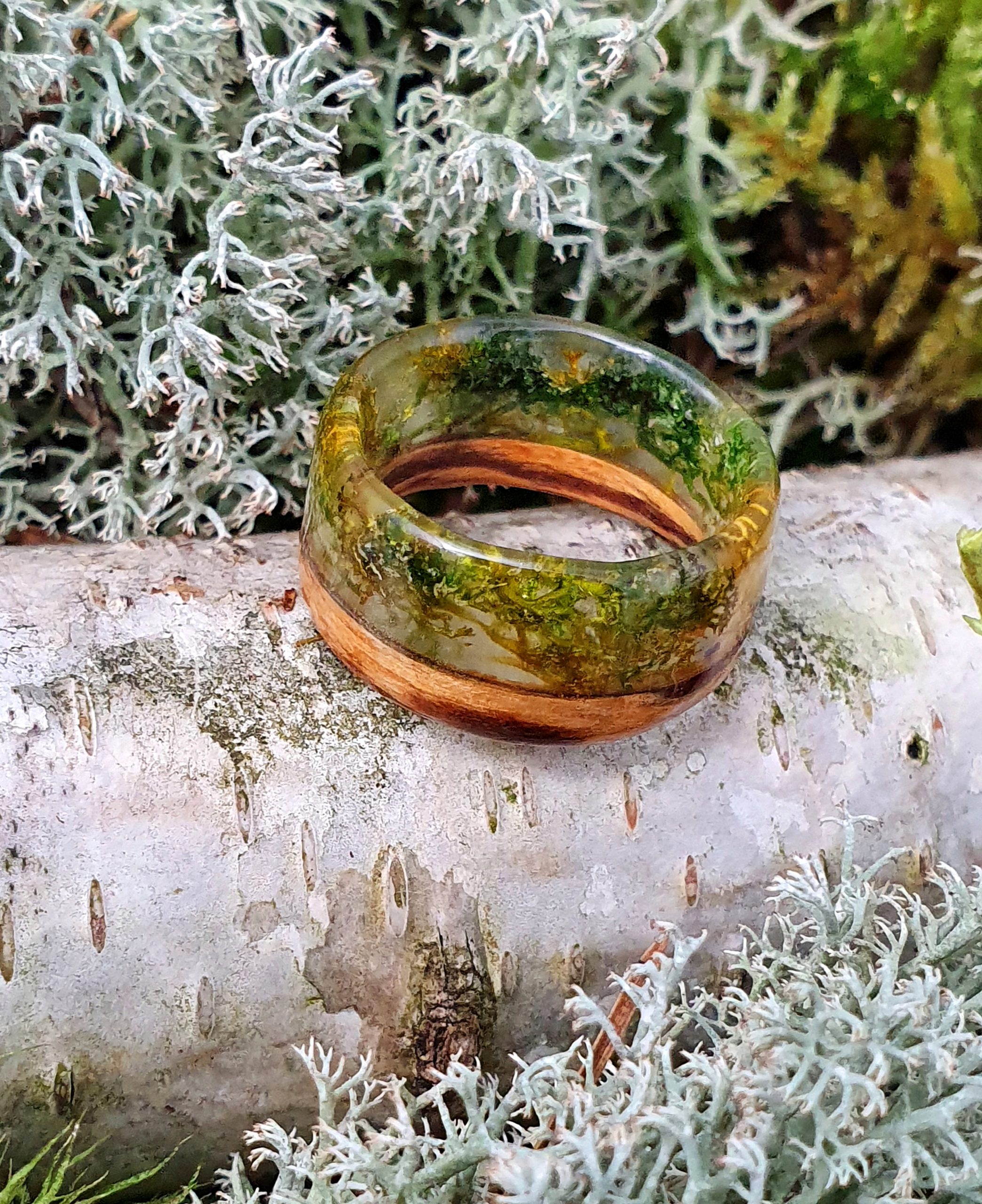 Pierścionek z drewna zebrano i chrobotka reniferowego otoczonego żywicą na bazie bio-komponentów.