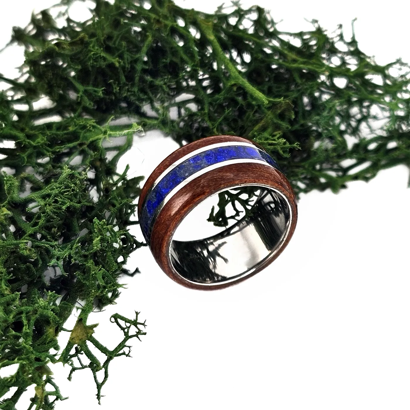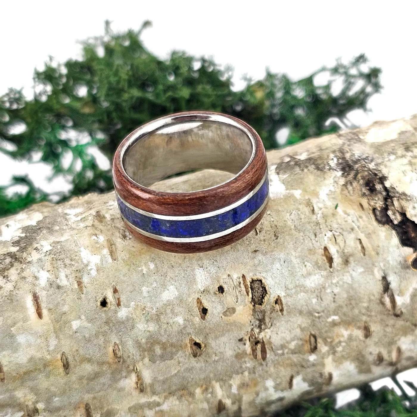 Pierścionek z tytanu i drewna jabłoni indyjskiej oraz lapis lazuli – harmonia natury.