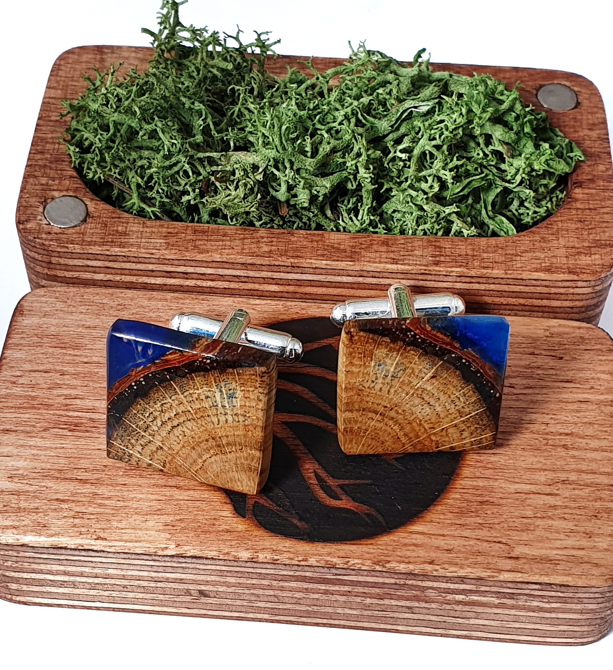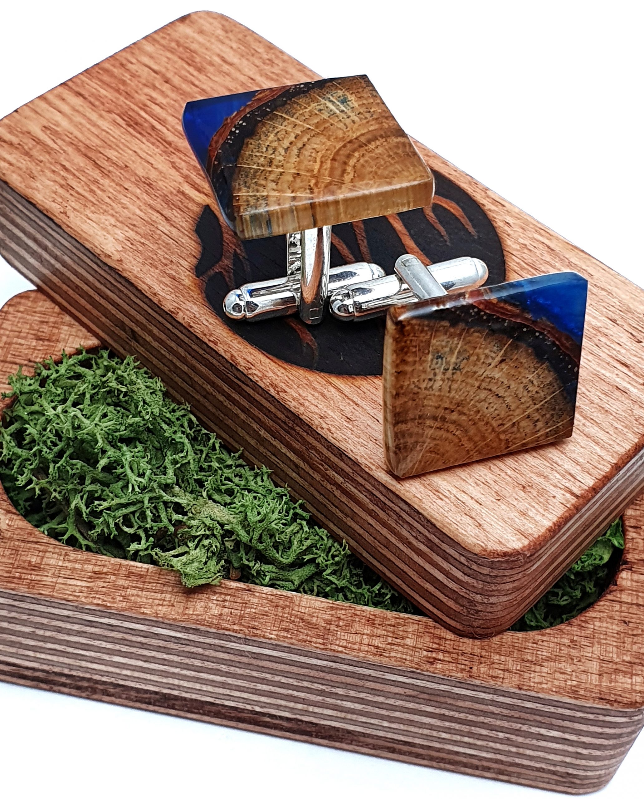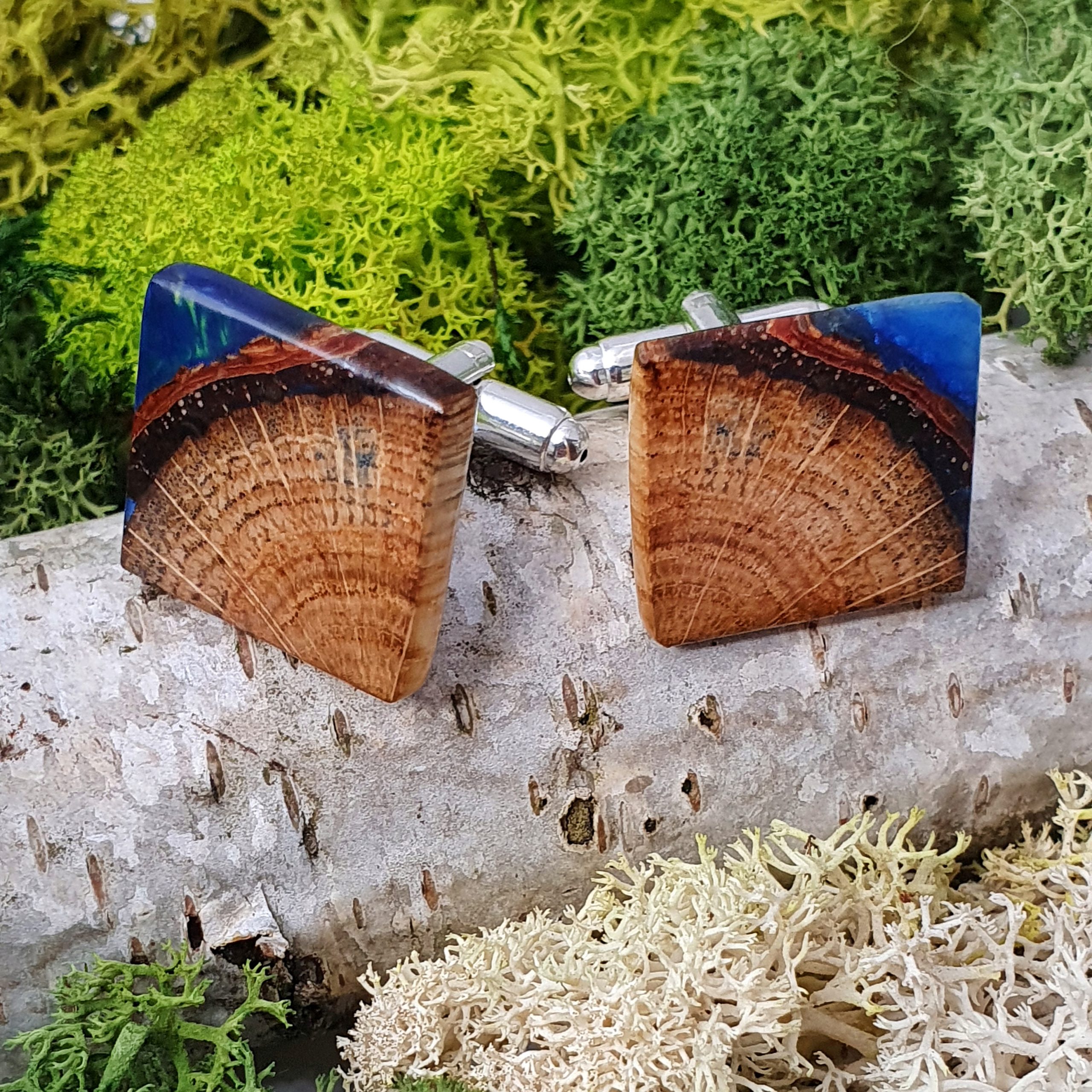 Oryginalne spinki do mankietów z drewna dębu oraz żywicy na bazie bio-komponentów.